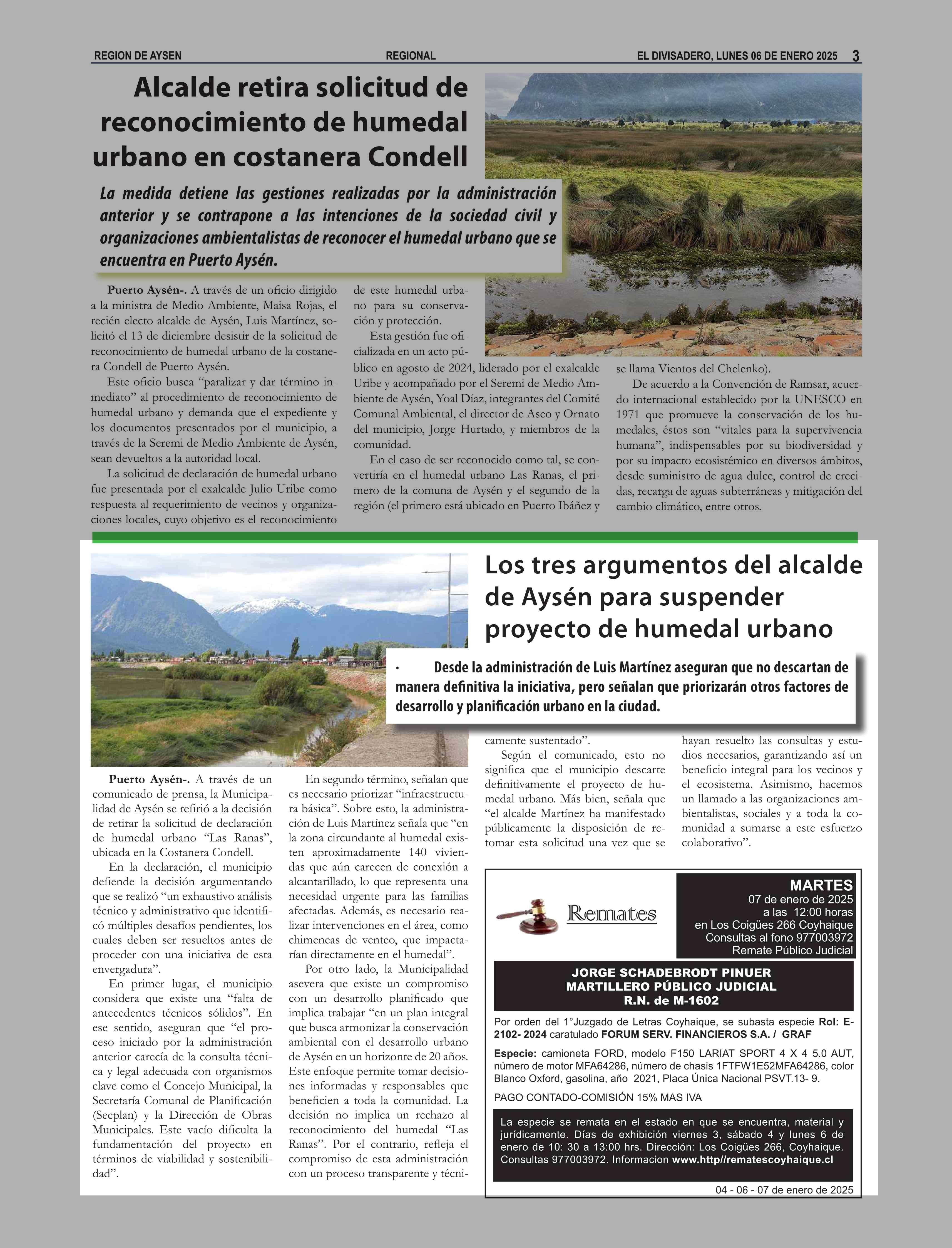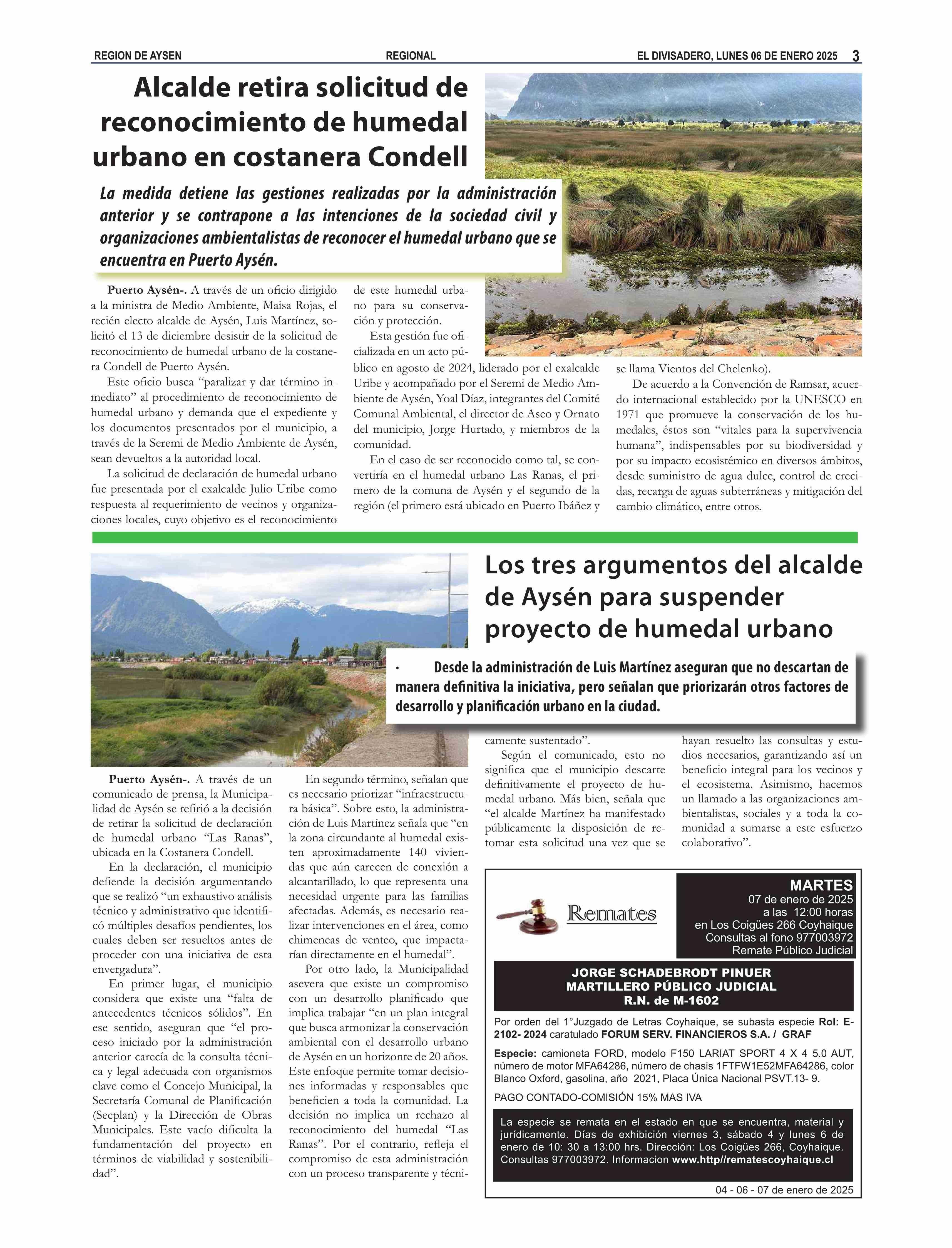 Los tres argumentos del alcalde de Aysén para suspender proyecto de humedal urbano 06-01-2025 El Divisadero |