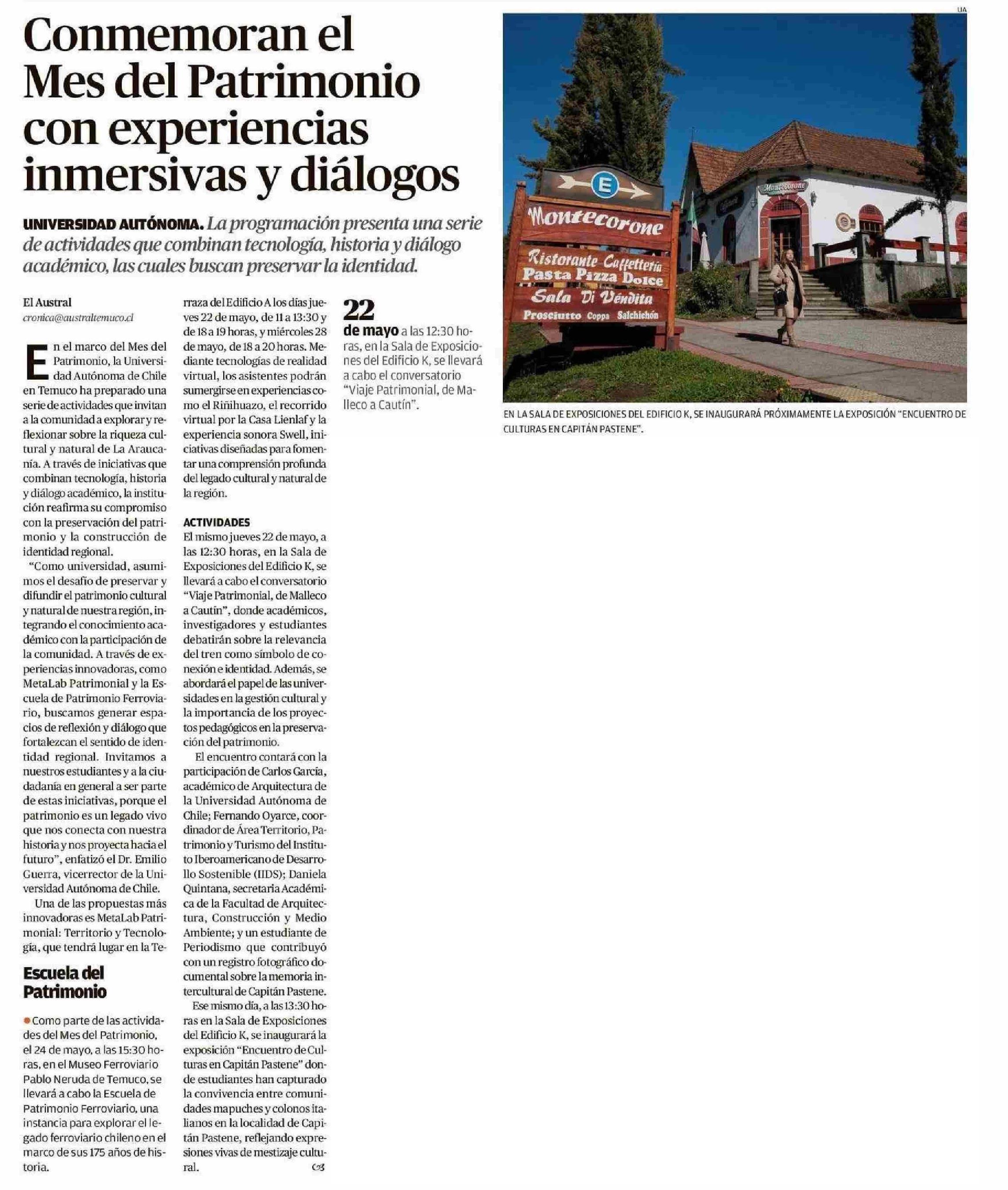 Conmemoran el Mes del Patrimonio con experiencias inmersivas y diálogos 19-05-2025 El Austral de la Araucanía |
