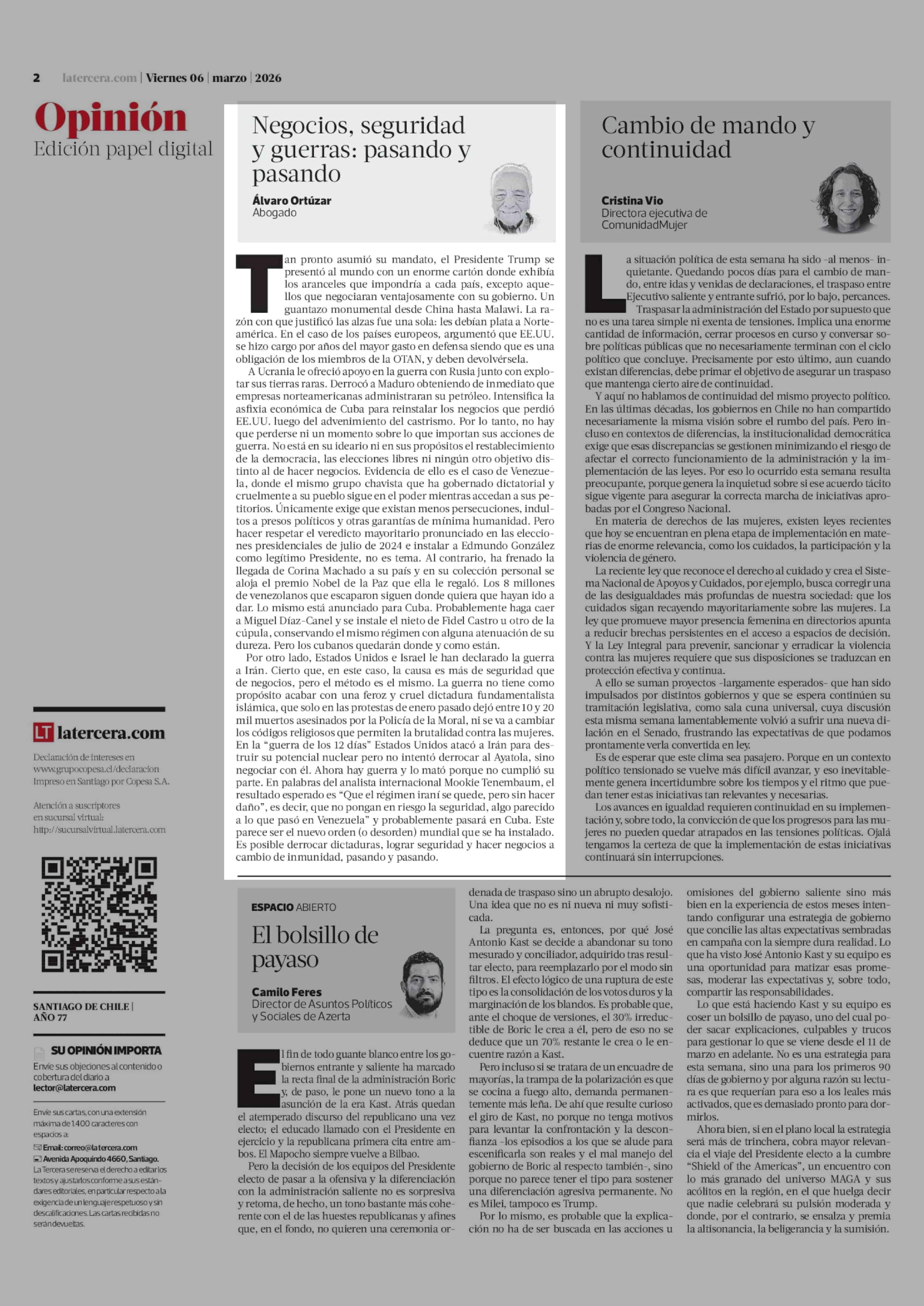 Columnas de Opinión: Negocios, seguridad y guerras: pasando y pasando 06-03-2026 La Tercera |