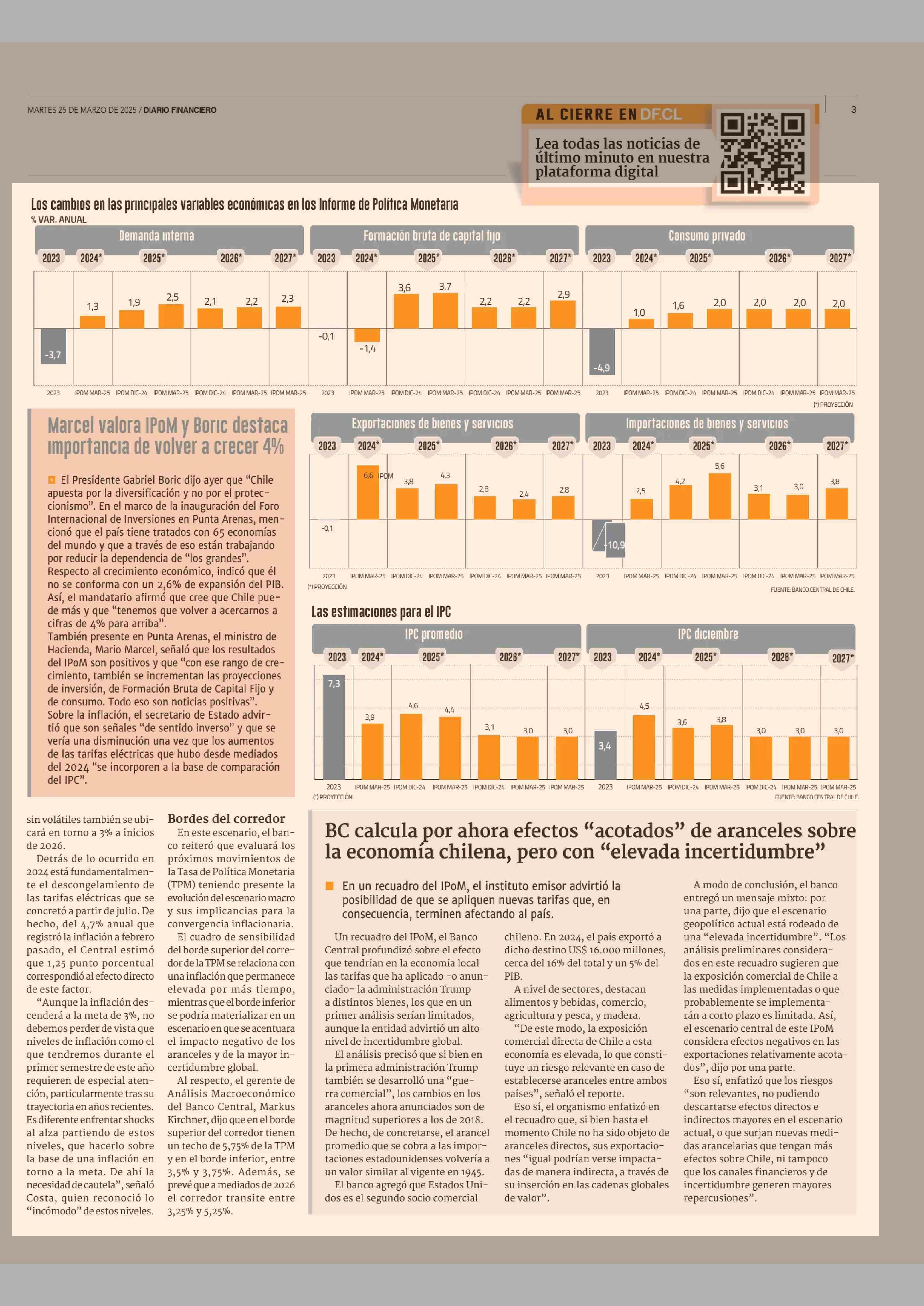 Banco Central sube pronósticos de PIB y de inflación para el año en medio de mayor alerta por la guerra comercial 25-03-2025 Diario Financiero |