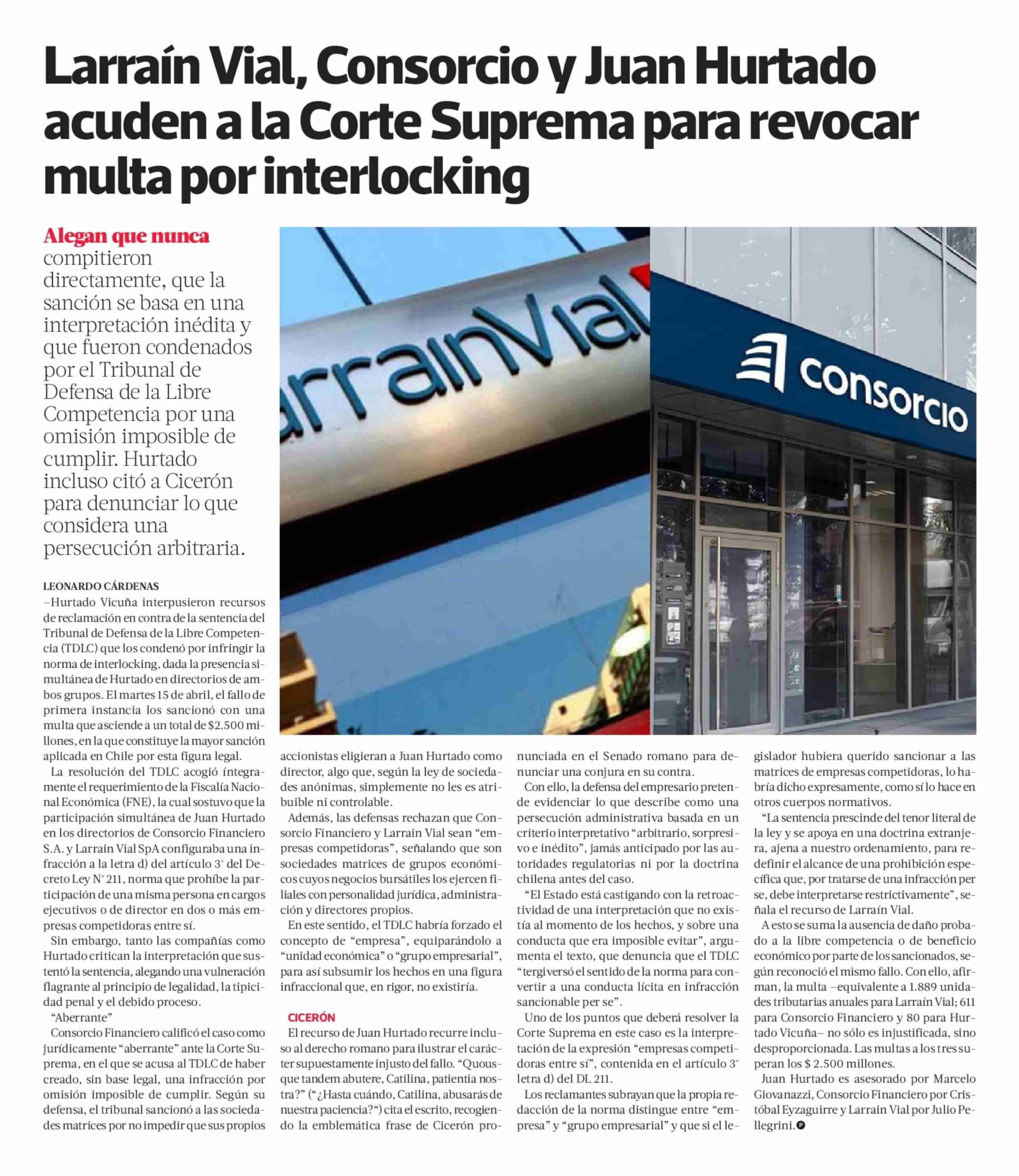 Larraín Vial, Consorcio y Juan Hurtado acuden a la Corte Suprema para revocar multa por interlocking 02-05-2025 La Tercera |