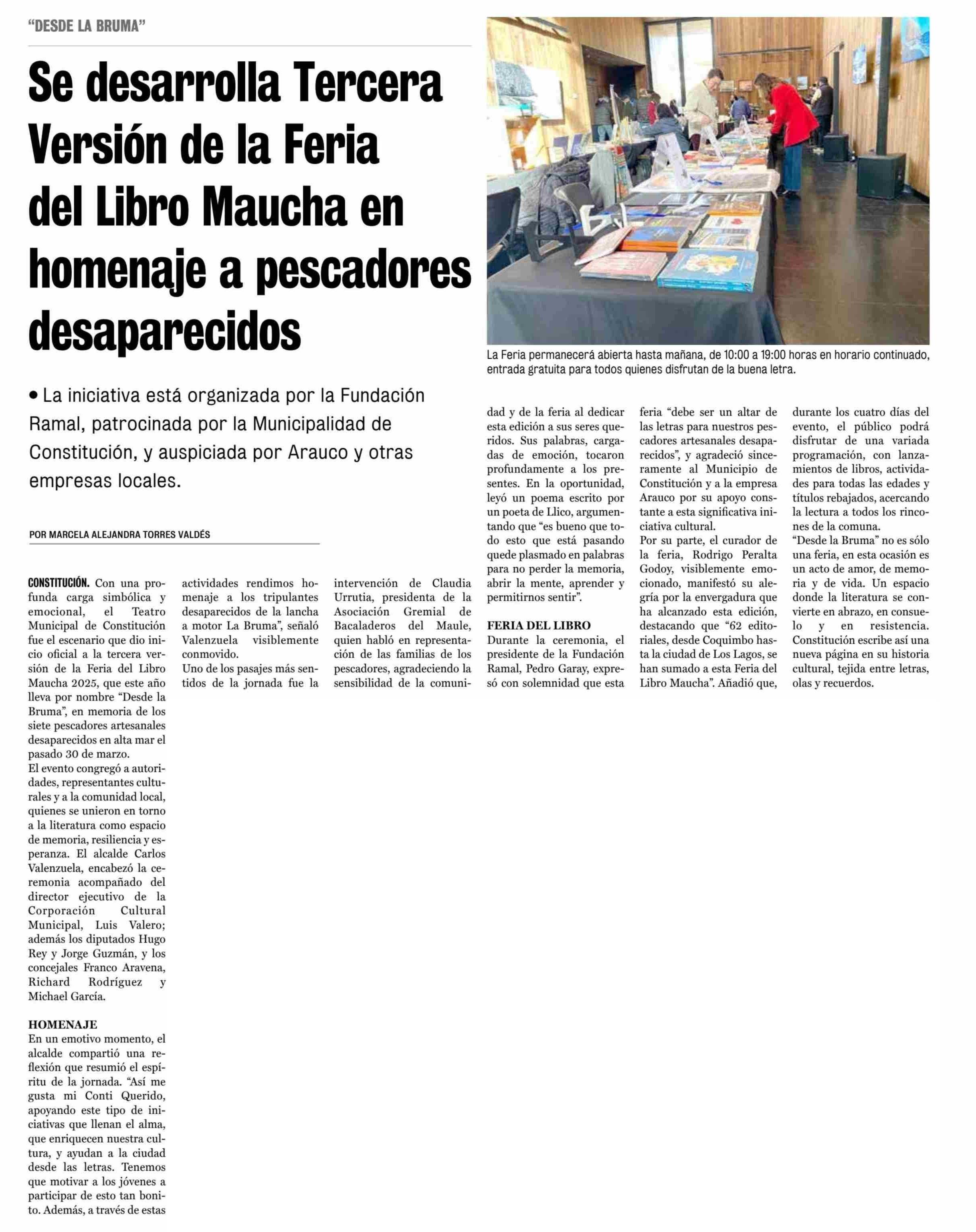 | Título: | Se desarrolla Tercera Versión de la Feria del Libro Maucha en homenaje a pescadores desaparecidos |
