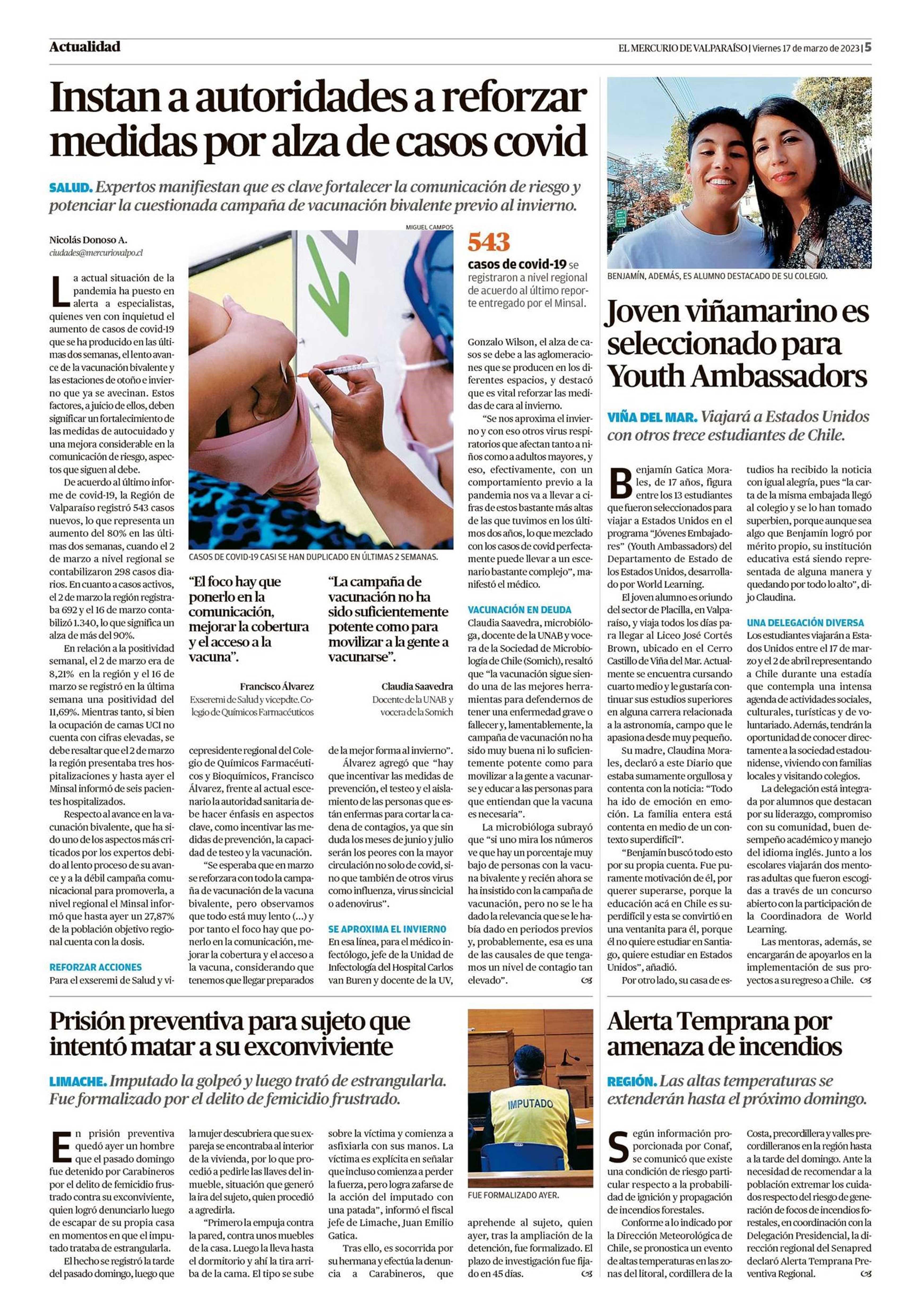 Instan a autoridades a reforzar medidas por alza de casos covid 17-03-2023 El Mercurio de Valparaíso |