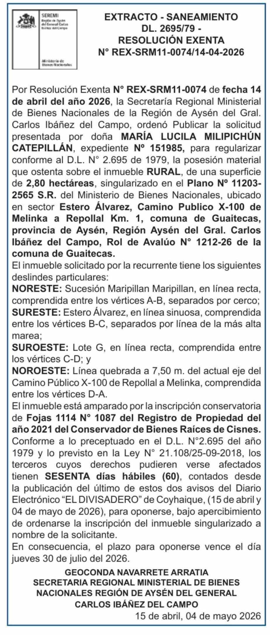 Título: Extractos: EXTRACTO - SANEAMIENTO DL. 2695/79 RESOLUCIÓN EXENTA Nº REX-SRM11-0074/14-04-2026