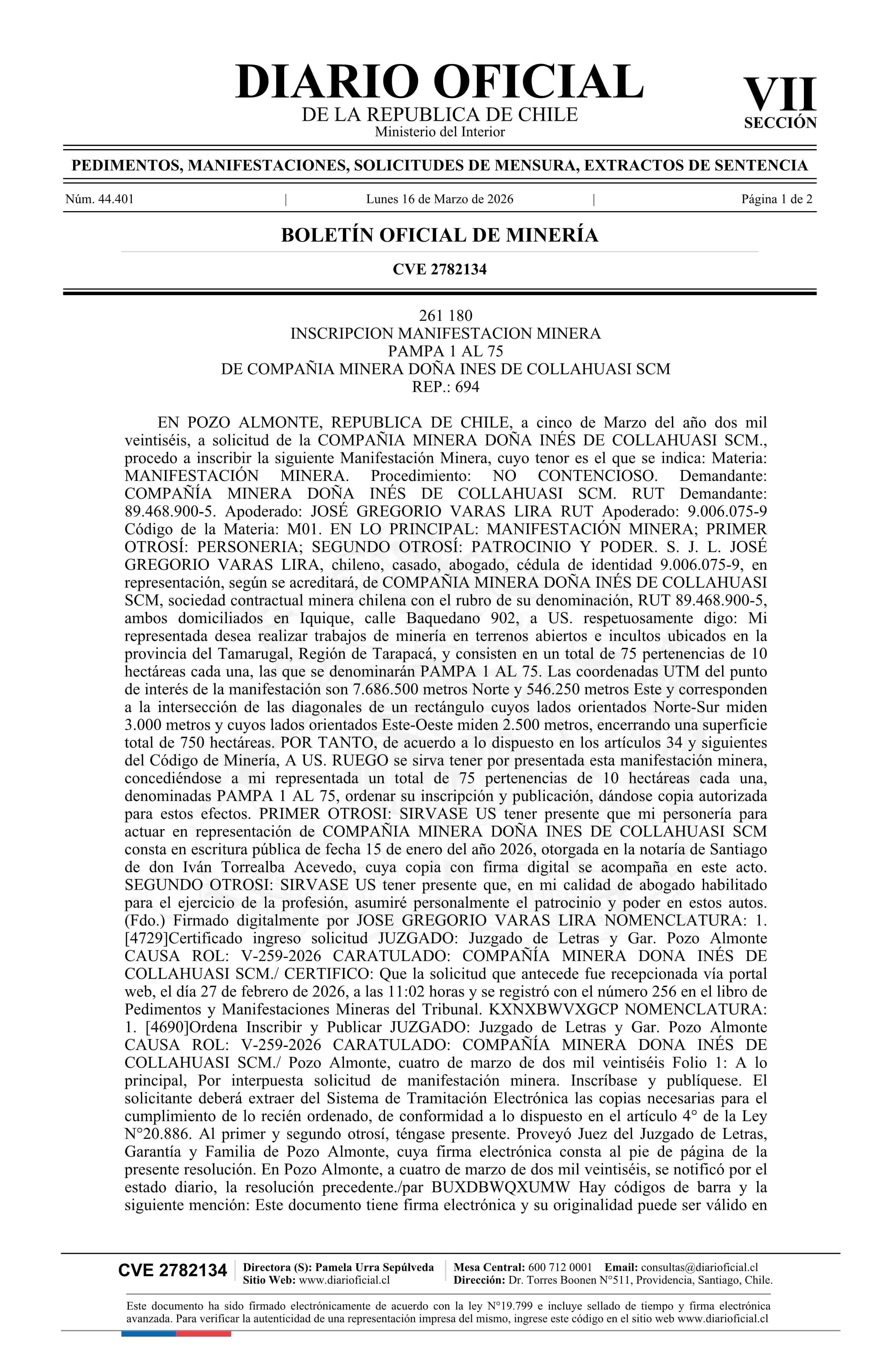 PAMPA 1 AL 75 / Compañía Minera Doña Inés de Collahuasi SCM 16-03-2026 DIARIO OFICIAL CHILE - BOLETÍN OFICIAL DE MINERÍA |