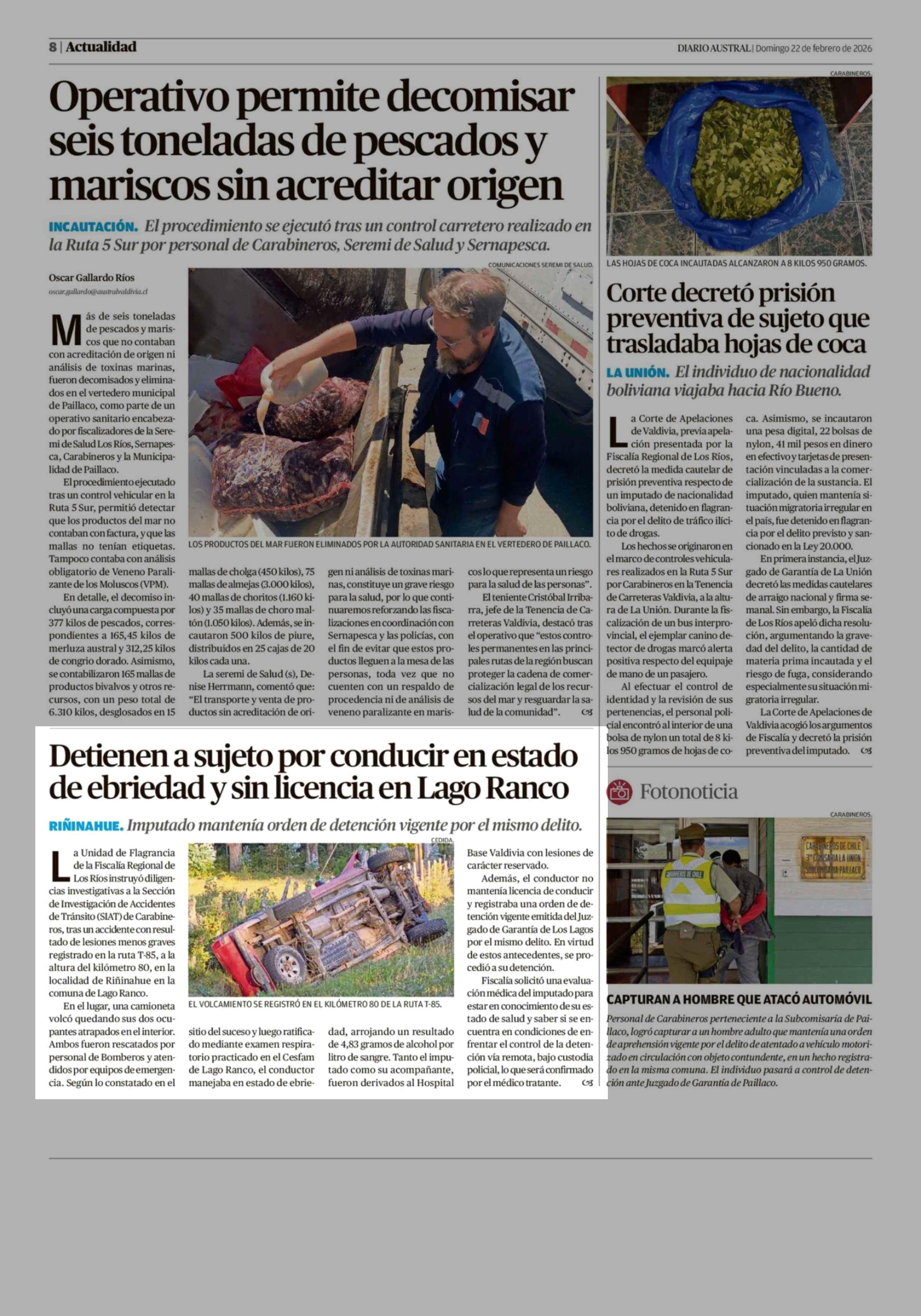 Detienen a sujeto por conducir en estado de ebriedad y sin licencia en Lago Ranco 22-02-2026 Diario Austral Región de Los Ríos |