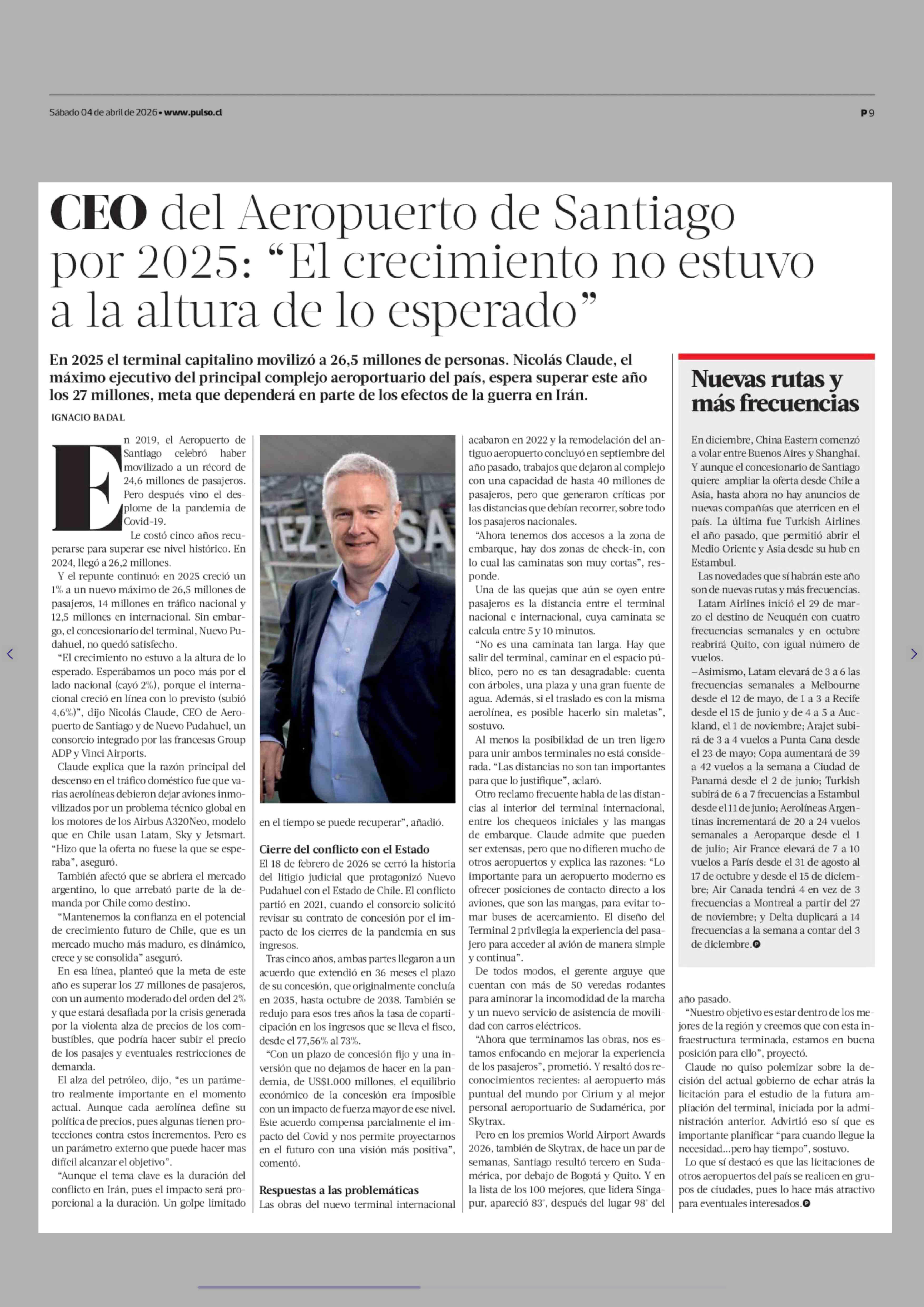 CEO del Aeropuerto de Santiago por 2025: "El crecimiento no estuvo a la altura de lo esperado" 04-04-2026 La Tercera |