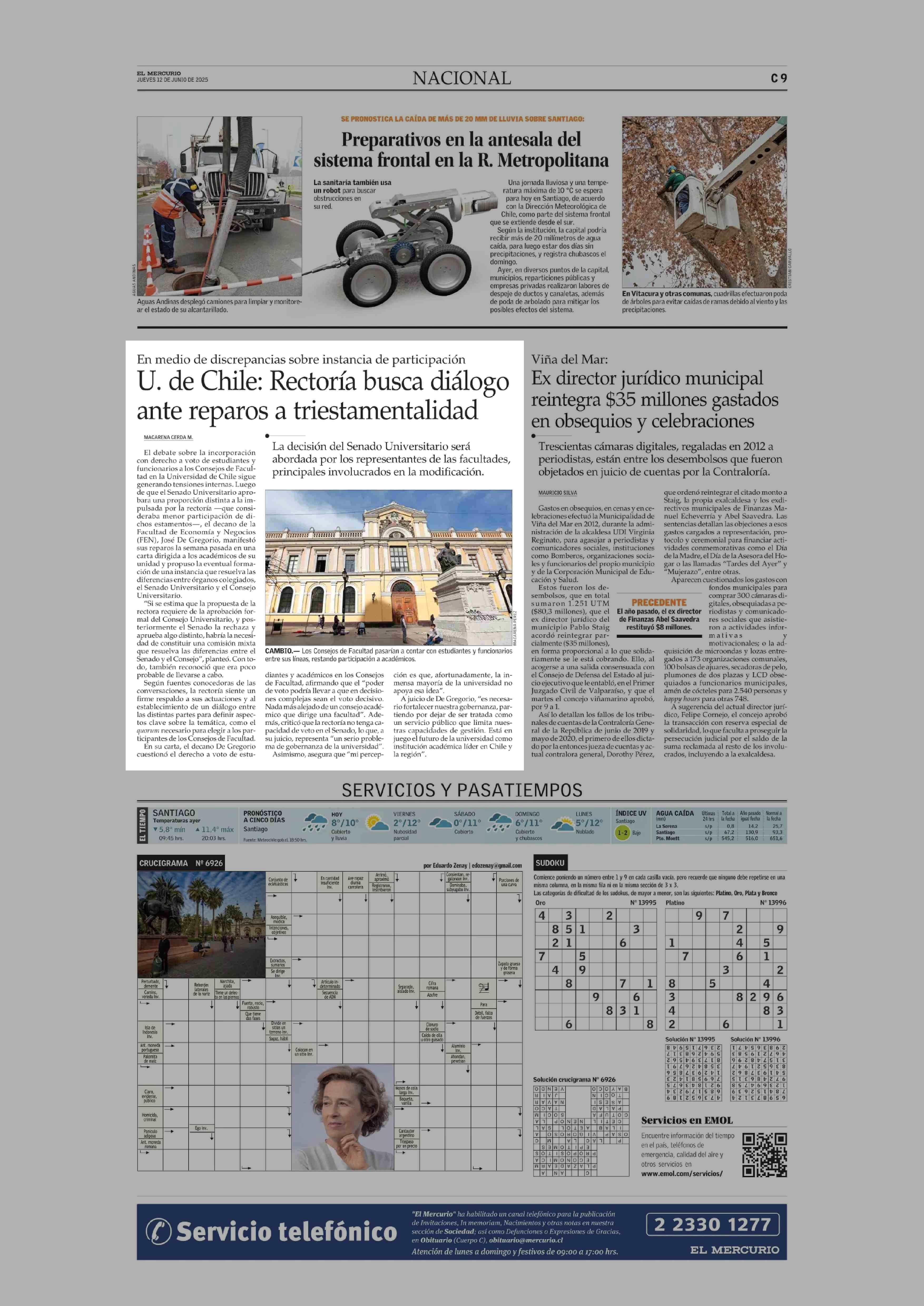 U. de Chile: Rectoría busca diálogo ante reparos a triestamentalidad 12-06-2025 El Mercurio |