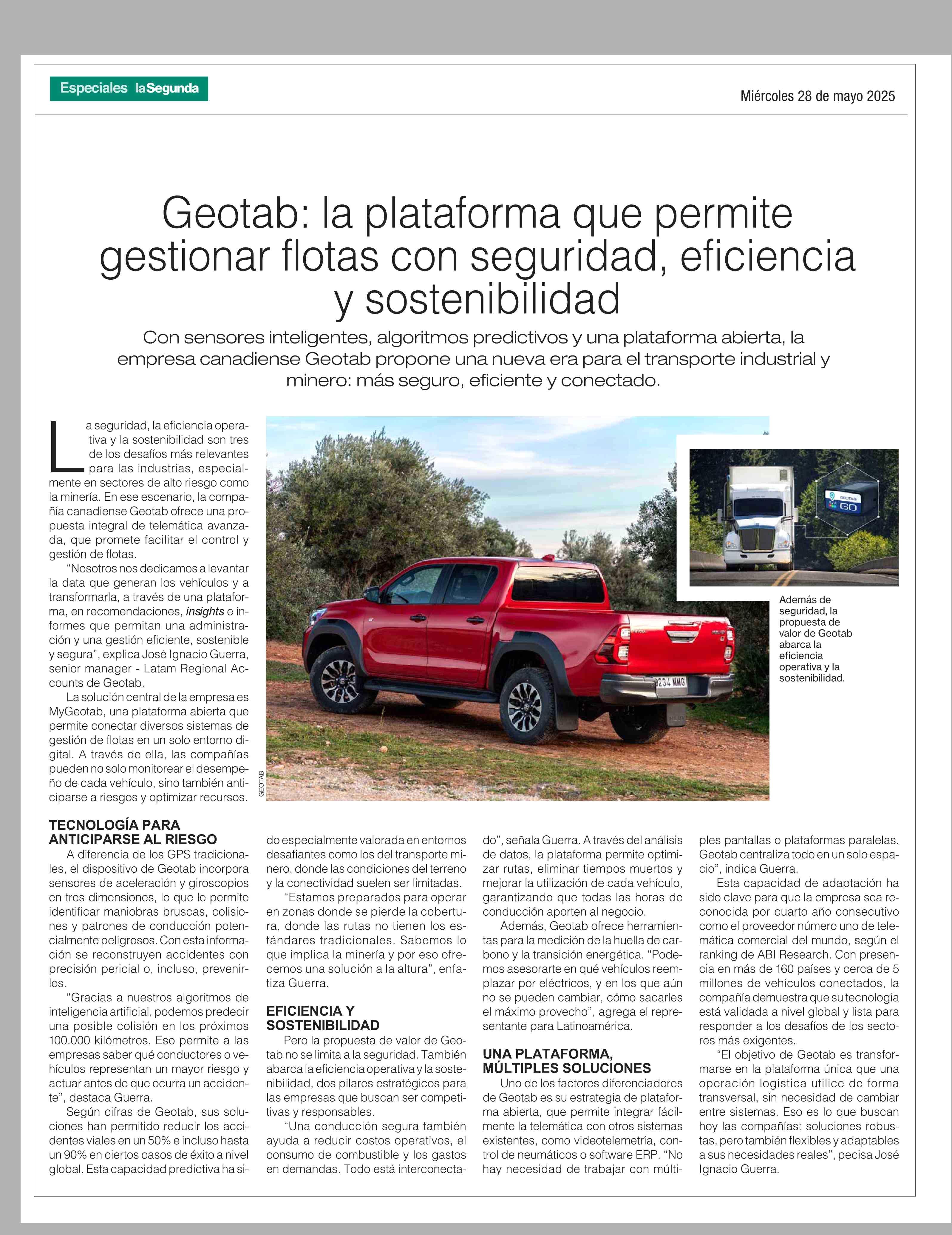 Geotab: la plataforma que permite gestionar flotas con seguridad, eficiencia y sostenibilidad 28-05-2025 La Segunda |