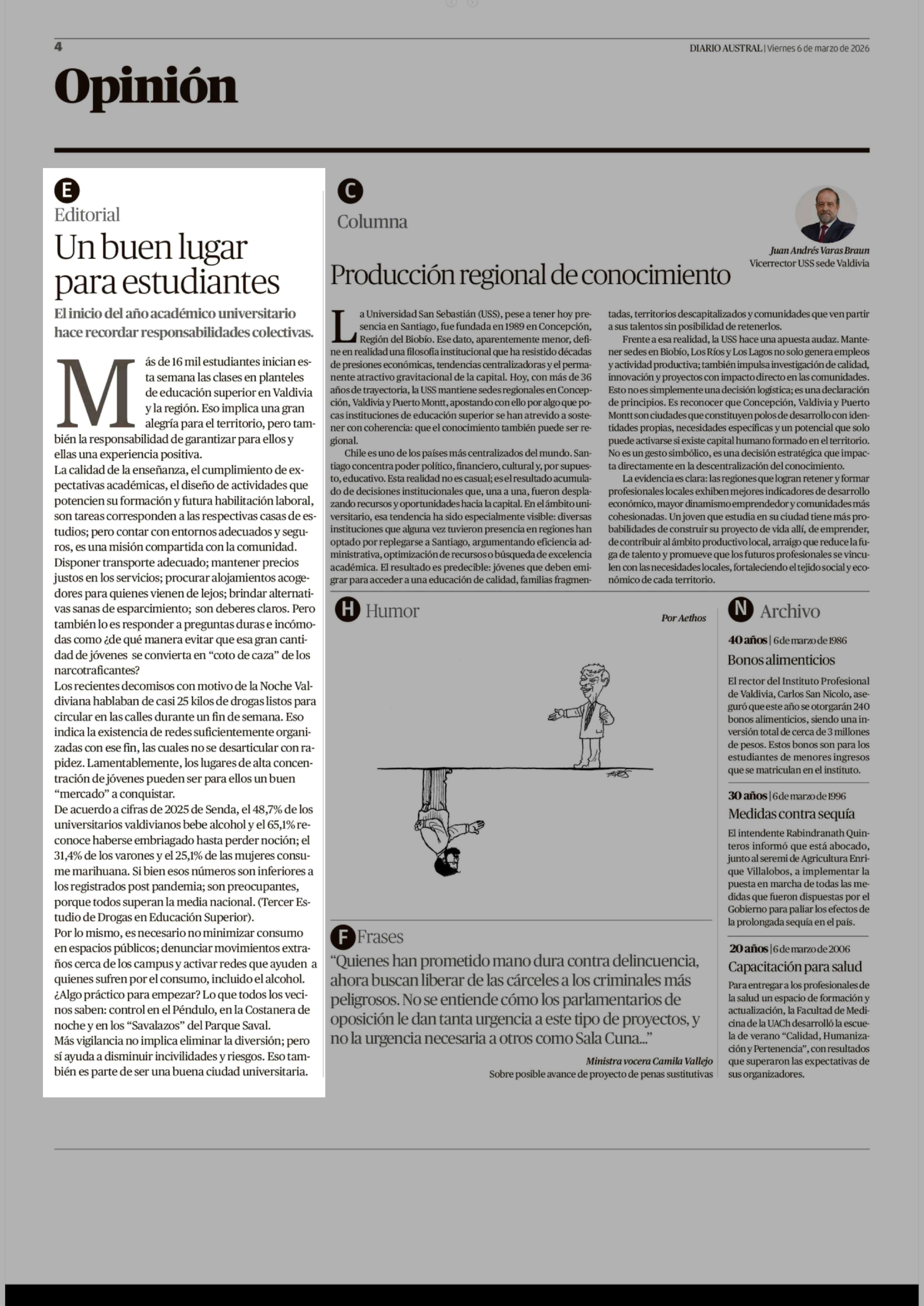 Editorial: Un buen lugar para estudiantes 06-03-2026 Diario Austral Región de Los Ríos |