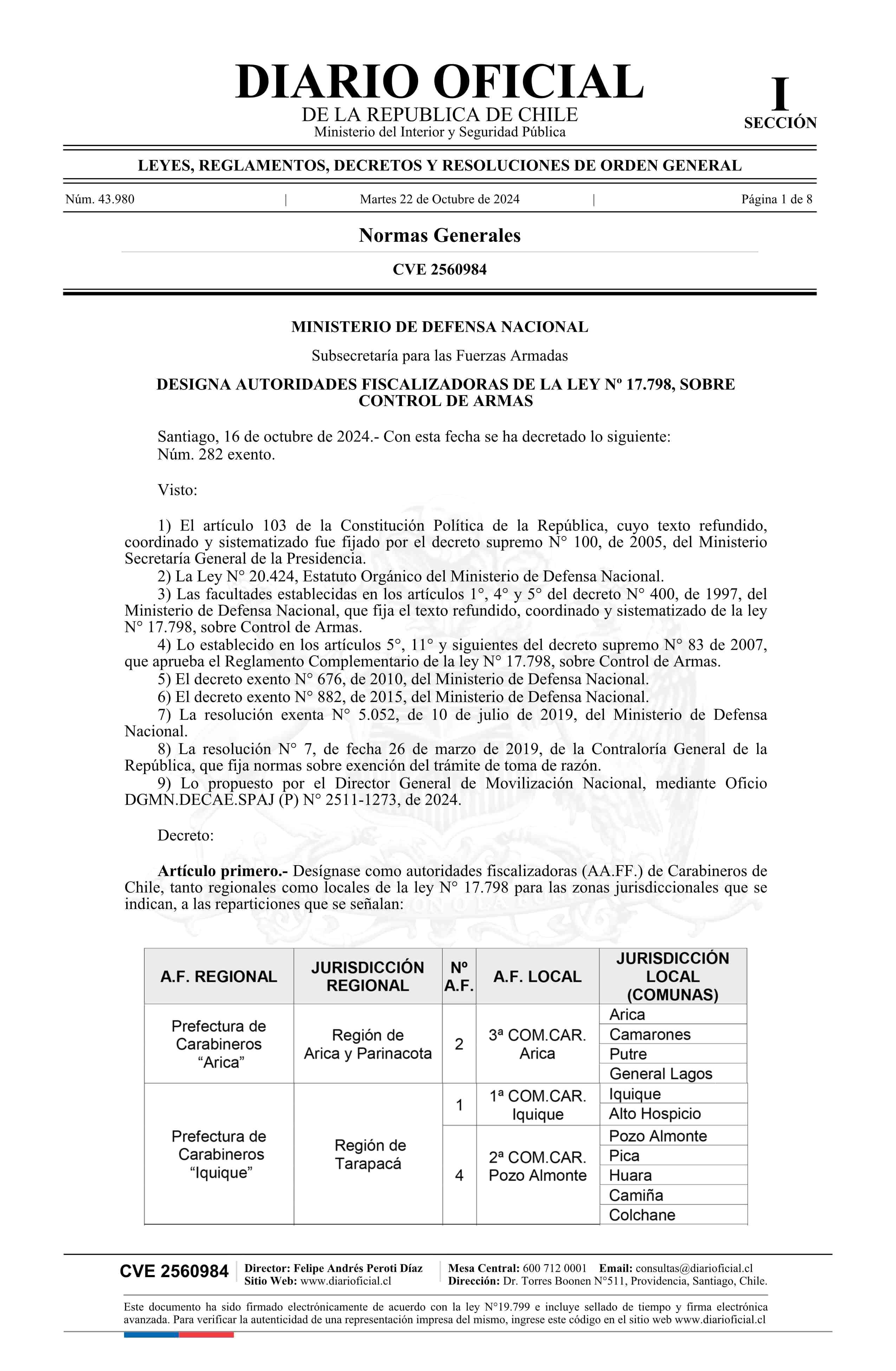 Decreto exento número 282, de 2024.- Designa autoridades fiscalizadoras de la ley N° 17.798, sobre Control de Armas 22-10-2024 Diario Oficial Edición Electrónica |