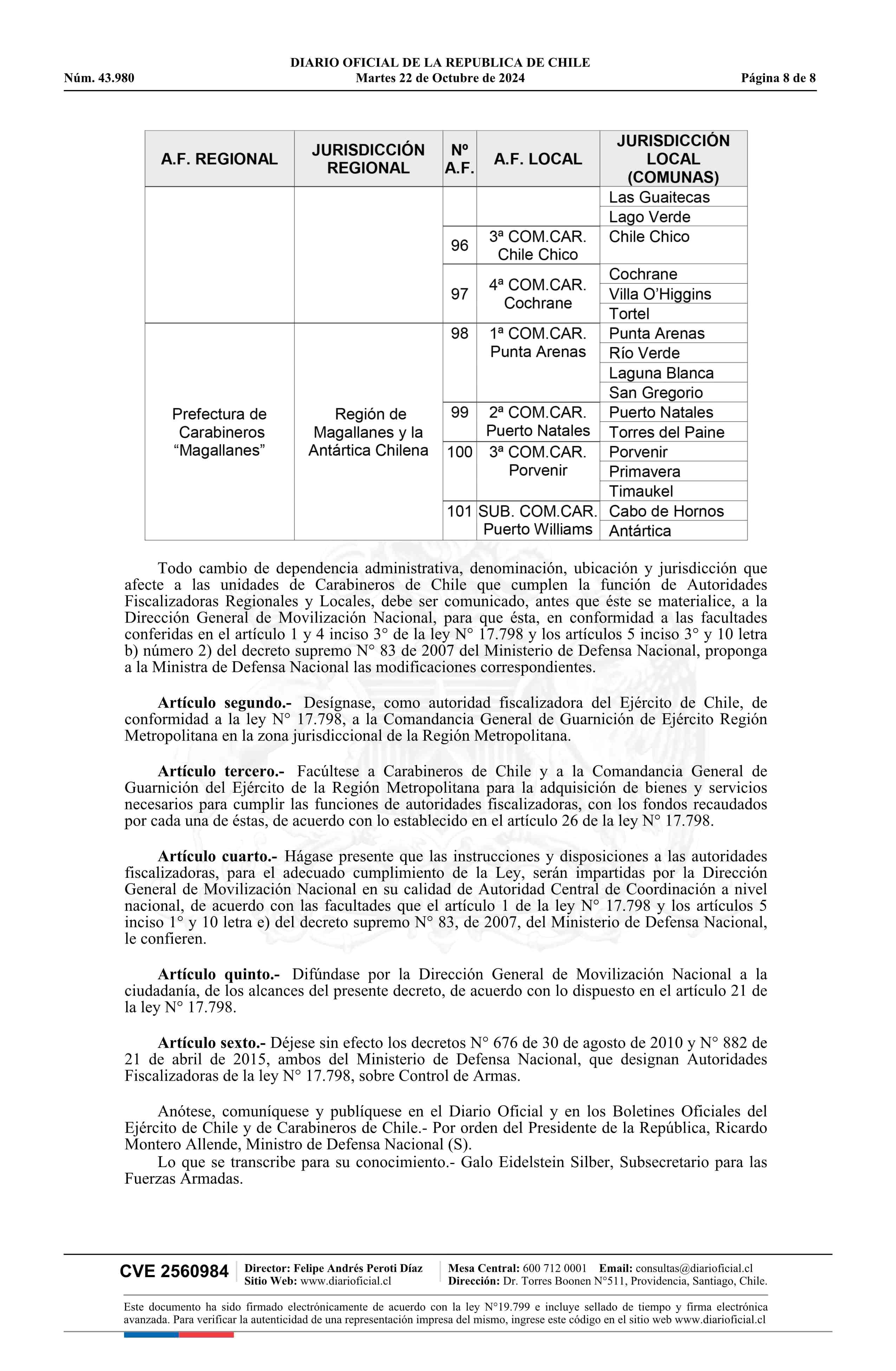 | Título: | Decreto exento número 282, de 2024.- Designa autoridades fiscalizadoras de la ley N° 17.798, sobre Control de Armas |