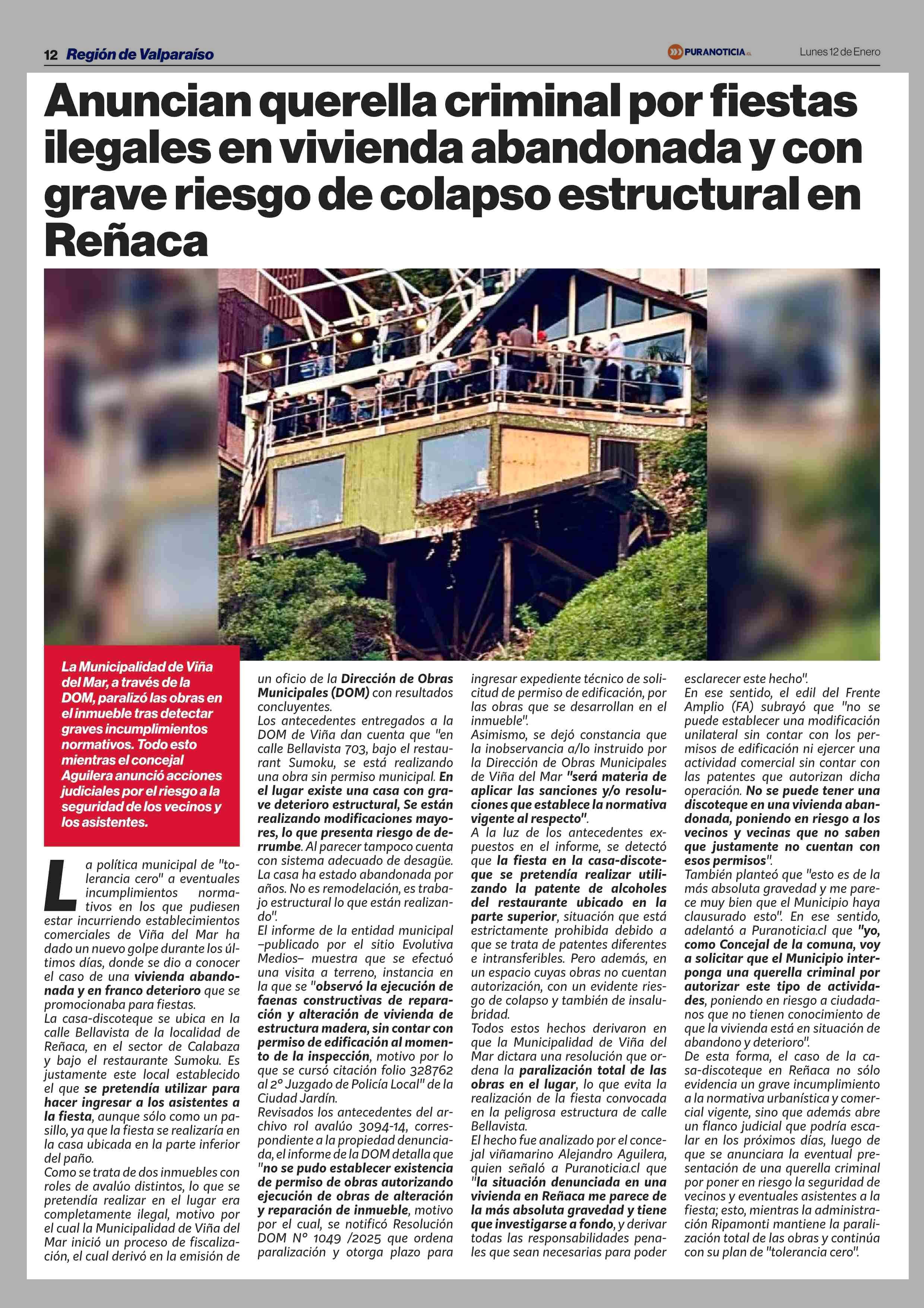 Anuncian querella criminal por fiestas ilegales en vivienda abandonada y con grave riesgo de colapso estructural en Reñaca 12-01-2026 Puranoticia.cl |