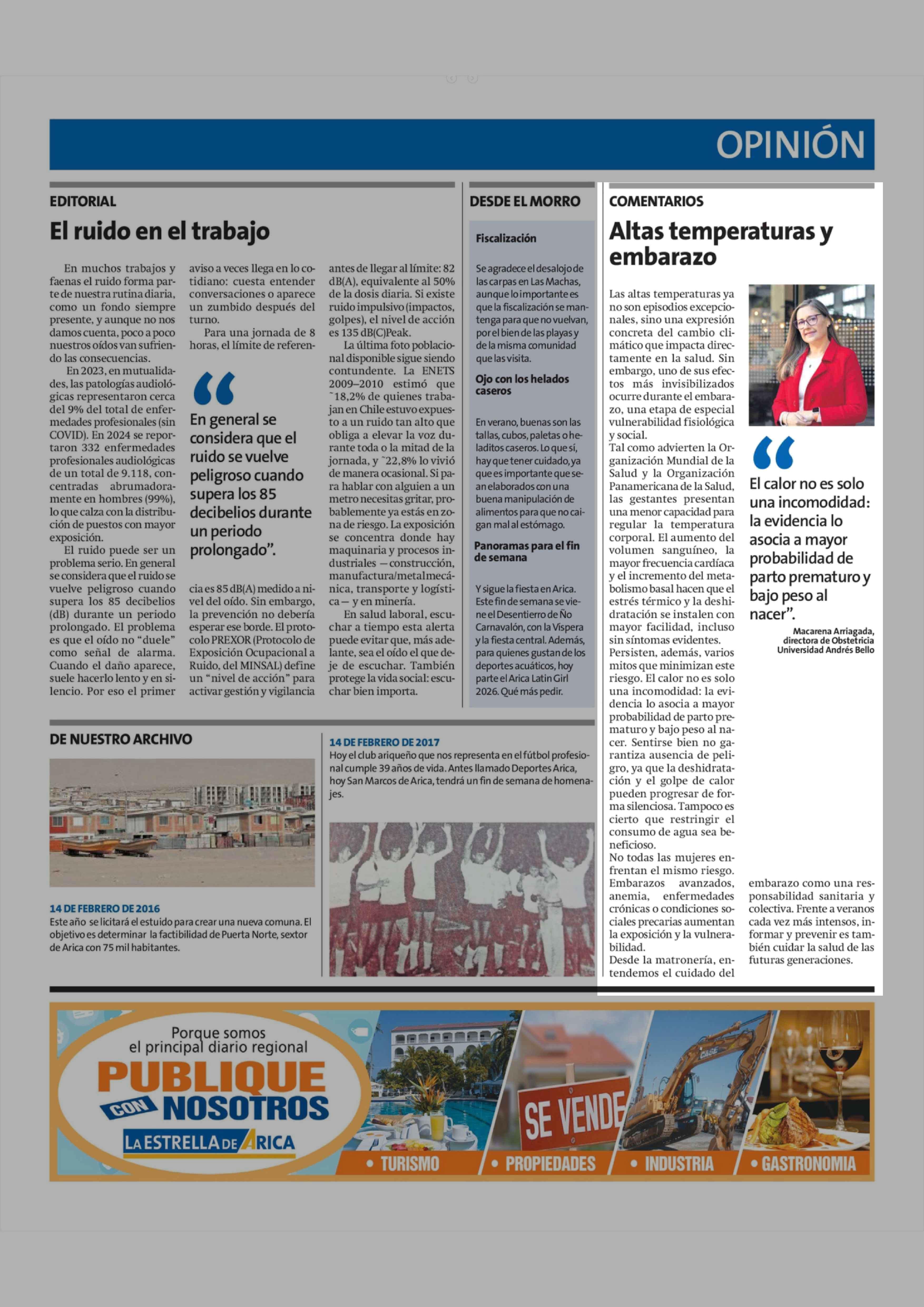 Columnas de Opinión: Altas temperaturas y embarazo 14-02-2026 La Estrella de Arica |
