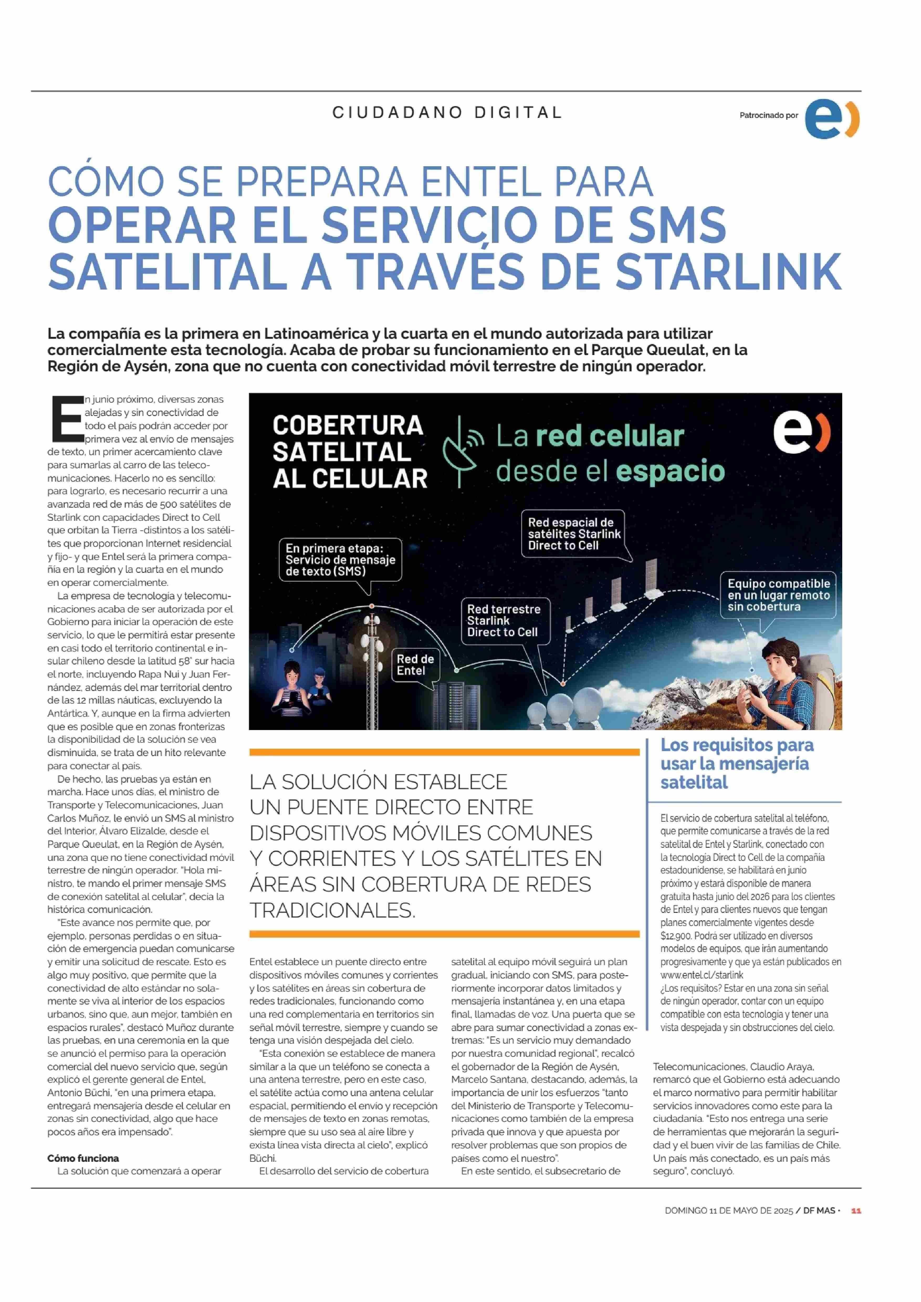 COMO SE PREPARA ENTEL PARA OPERAR EL SERVICIO DE SMS SATELITAL A TRAVES DE STARLINK 11-05-2025 Diario Financiero |