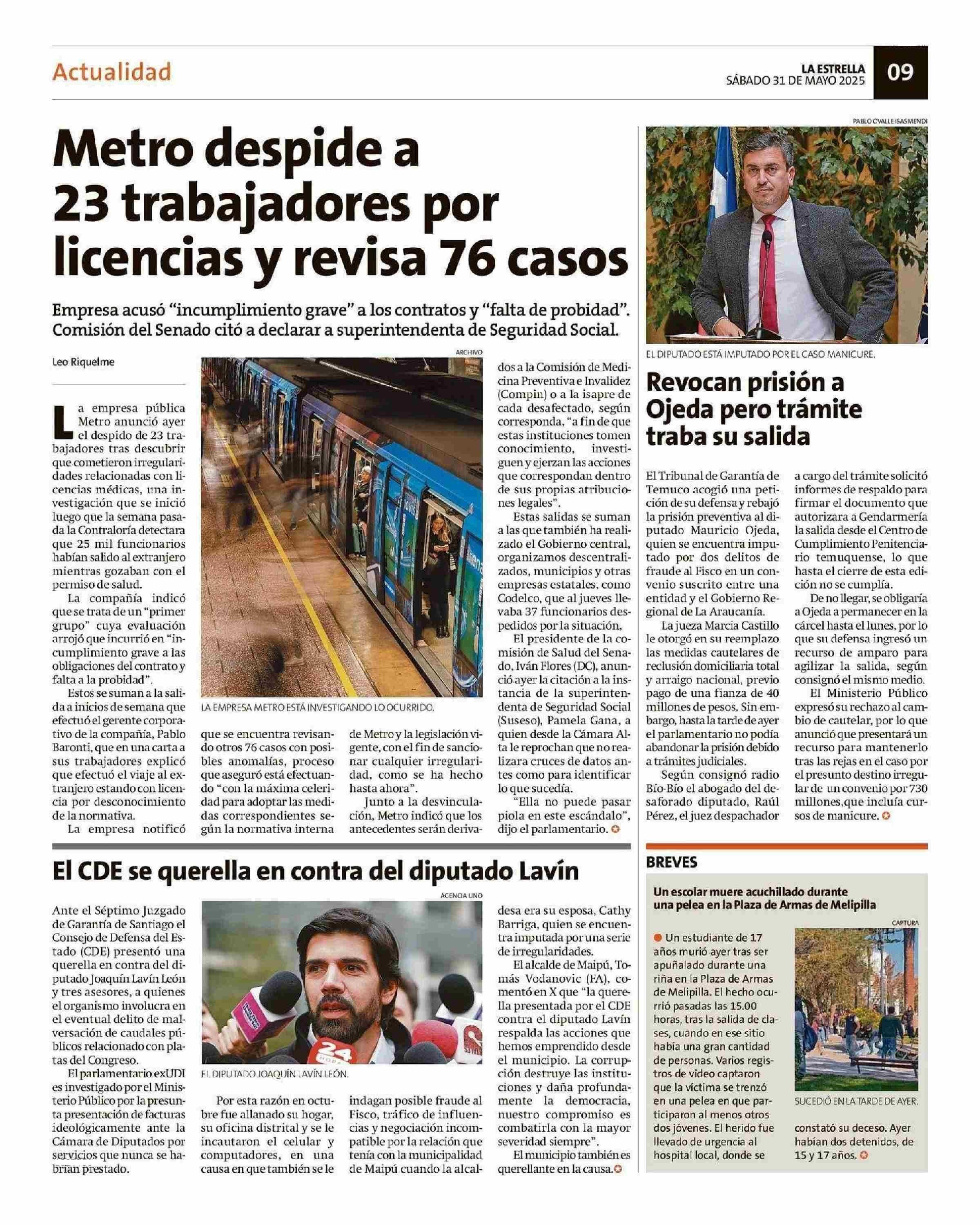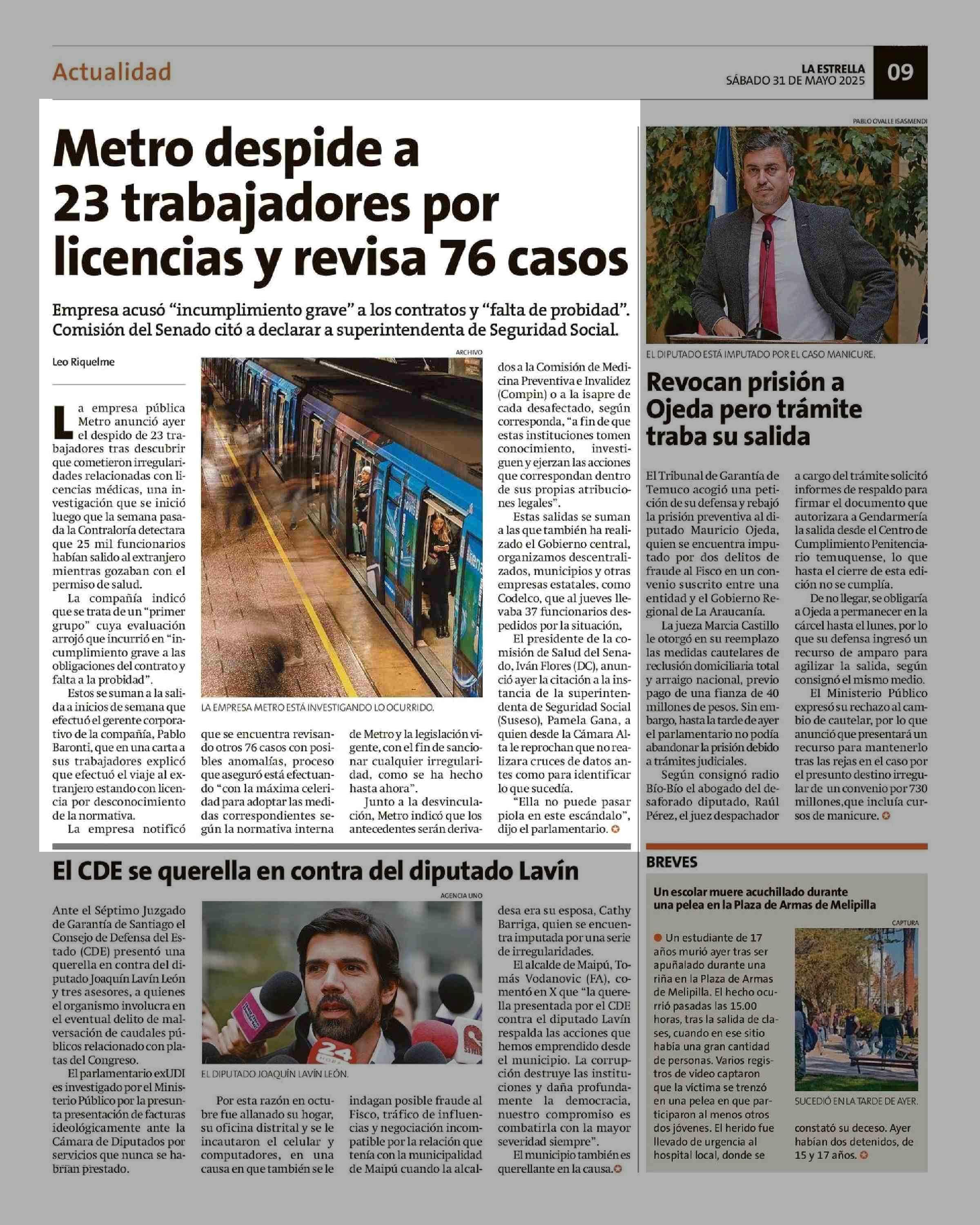 Metro despide a 23 trabajadores por licencias y revisa 76 casos 31-05-2025 La Estrella de Valparaíso |