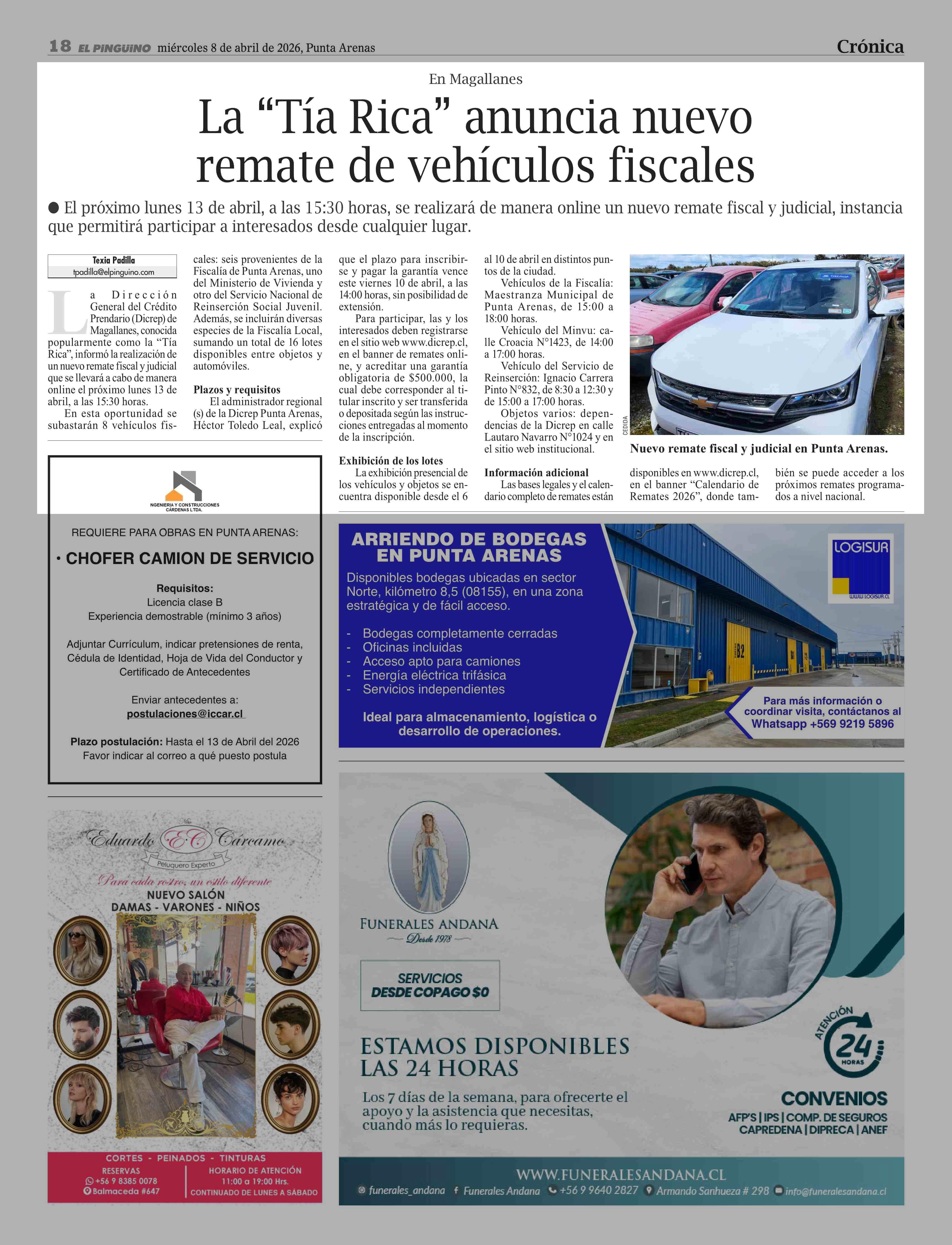 La “Tía Rica” anuncia nuevo remate de vehículos fiscales 08-04-2026 El Pingüino |