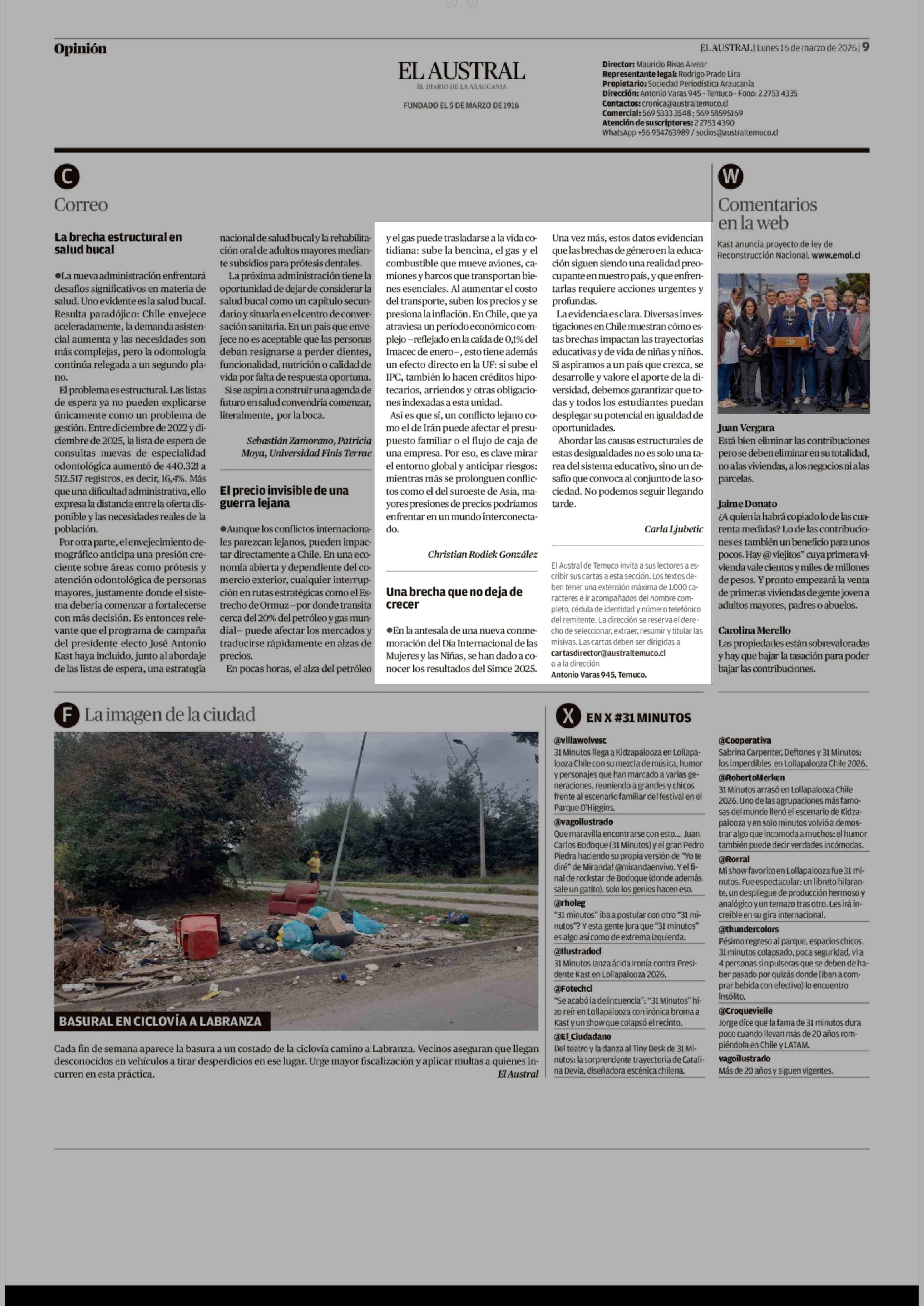 Cartas: Una brecha que no deja de crecer 16-03-2026 El Austral de la Araucanía |