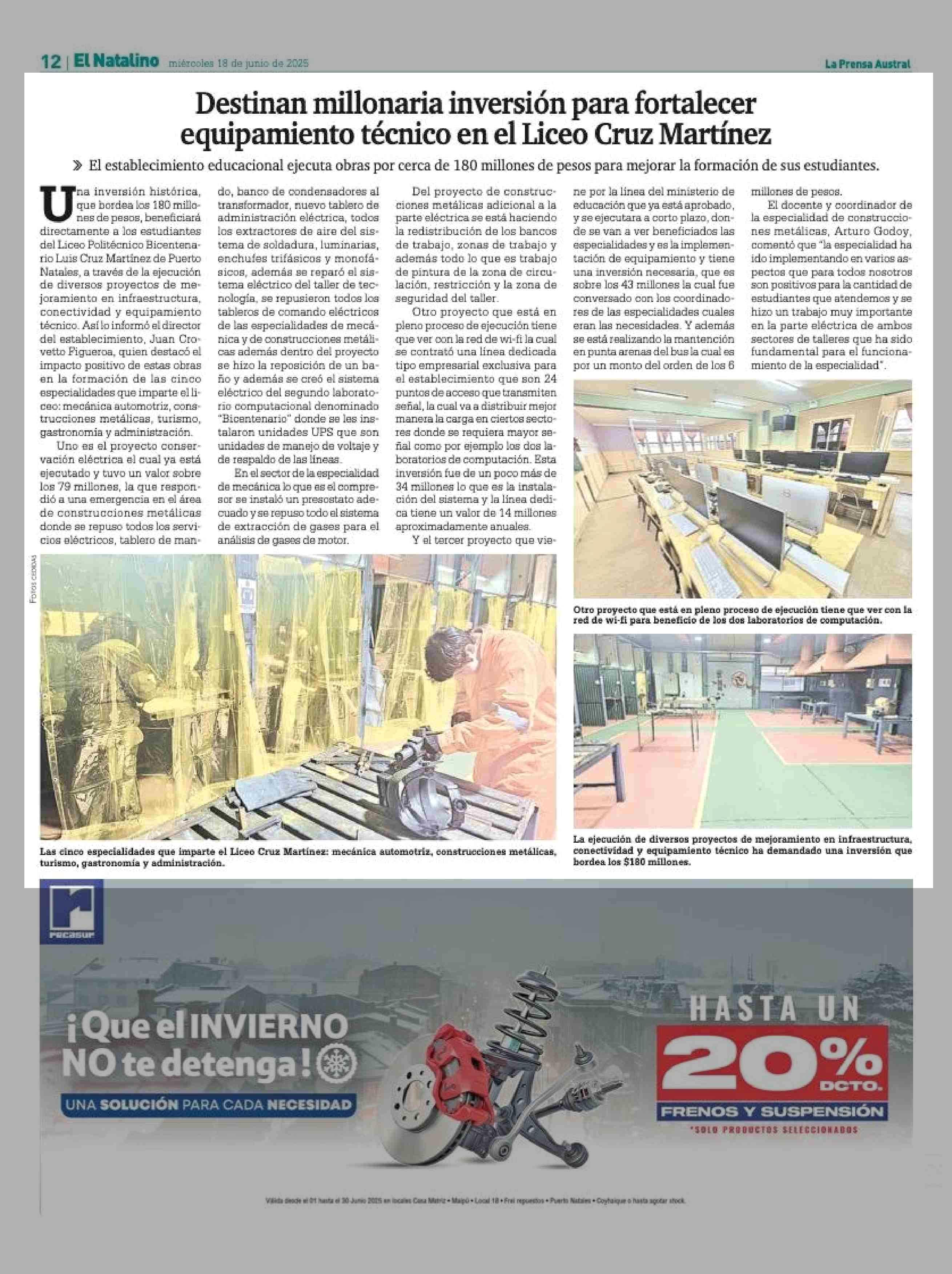 Destinan millonaria inversión para fortalecer equipamiento técnico en el Liceo Cruz Martínez 18-06-2025 La Prensa Austral |
