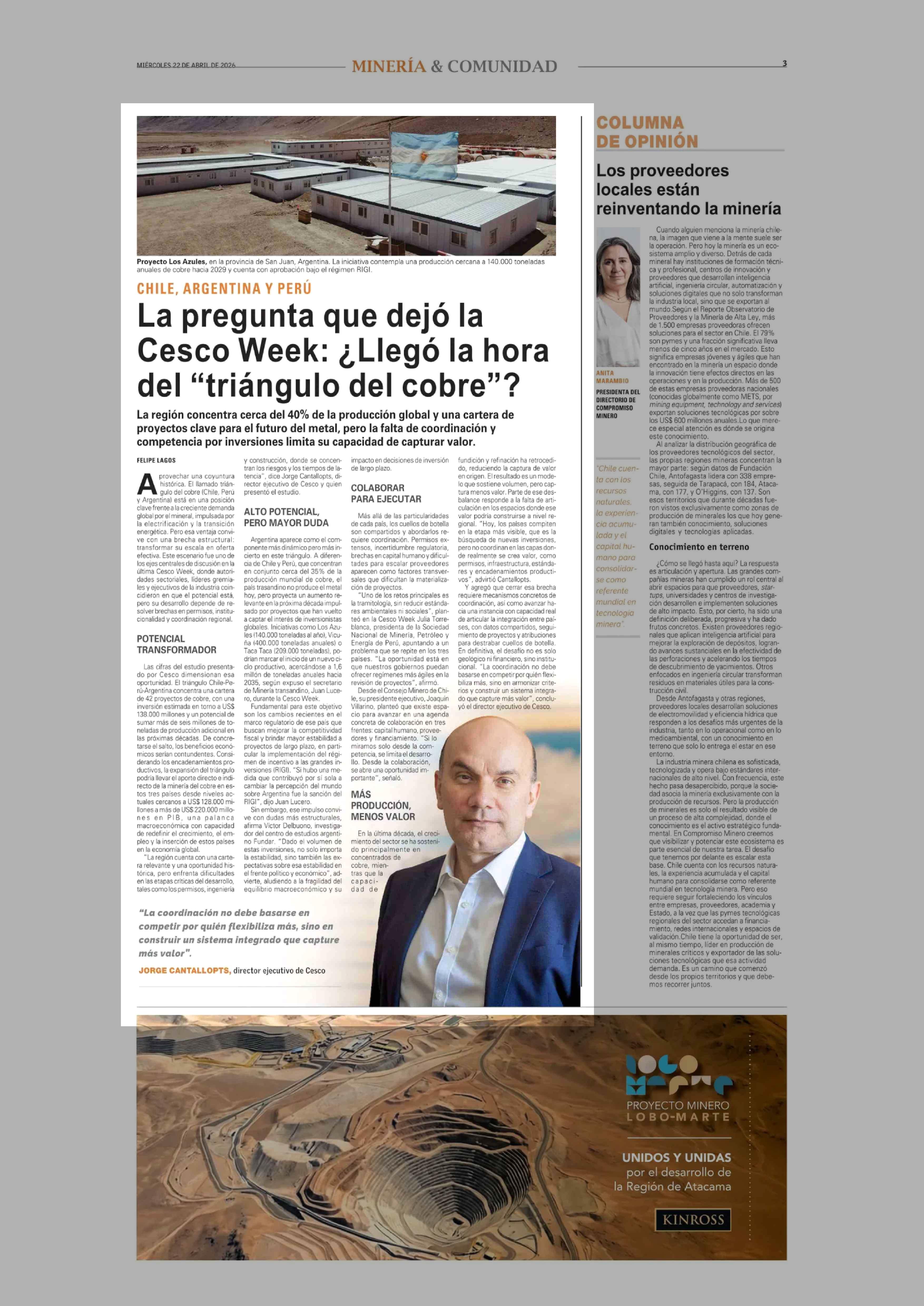 La pregunta que dejó la Cesco Week: ¿Llegó la hora del "triángulo del cobre"? 22-04-2026 El Mercurio |