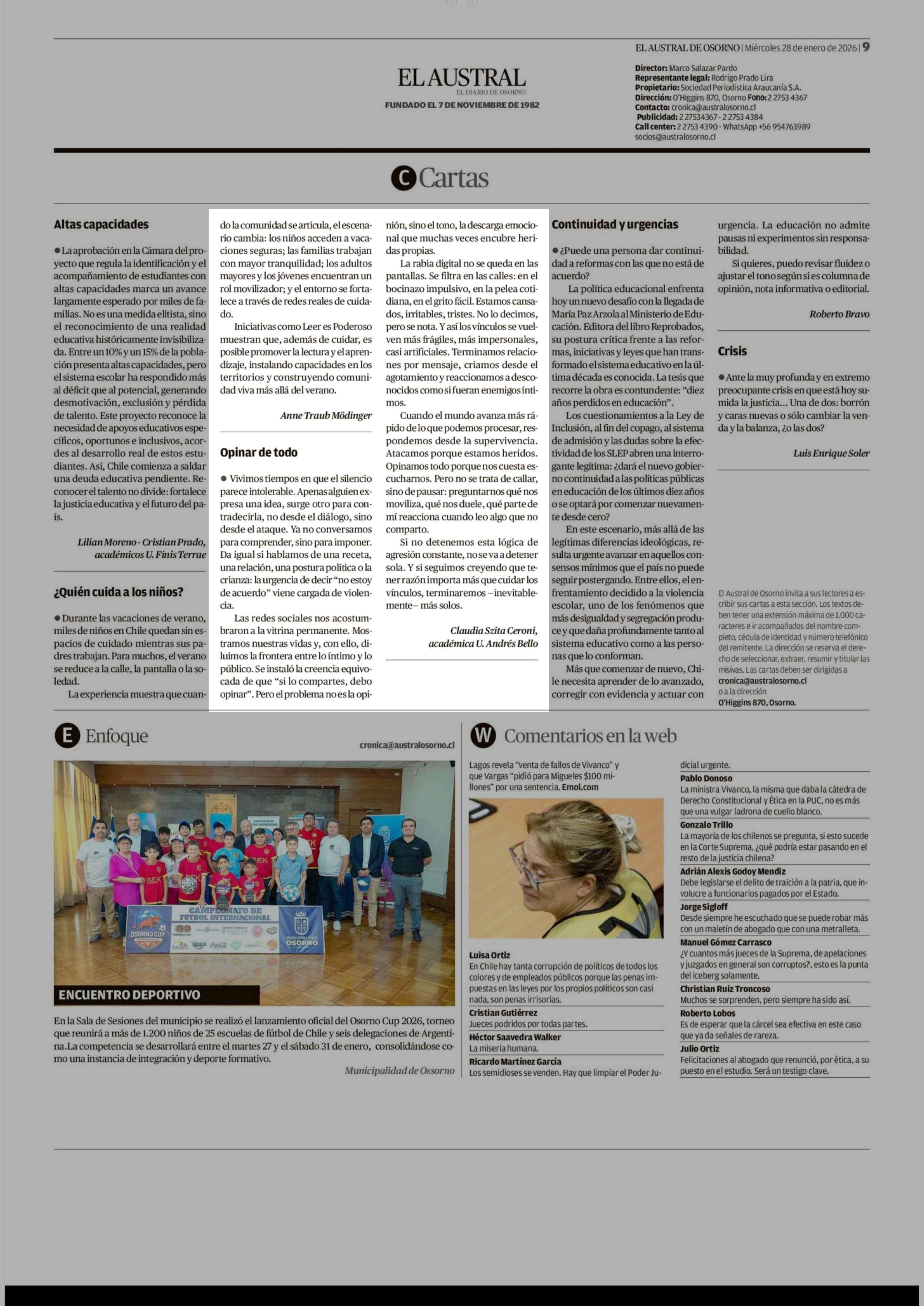 Cartas: Opinar de todo 28-01-2026 El Austral de Osorno |