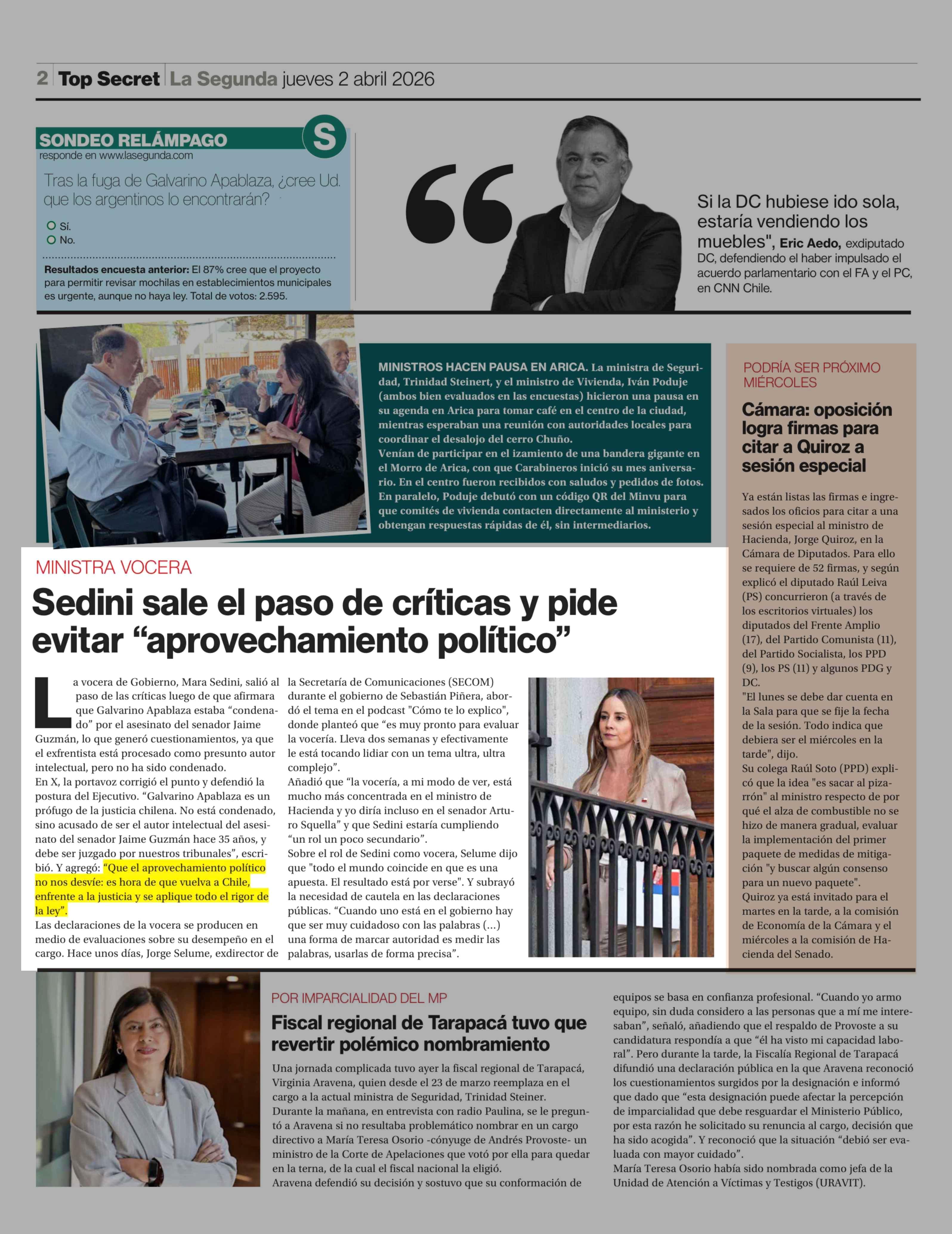 Sedini sale el paso de críticas y pide evitar "aprovechamiento político" 02-04-2026 La Segunda |