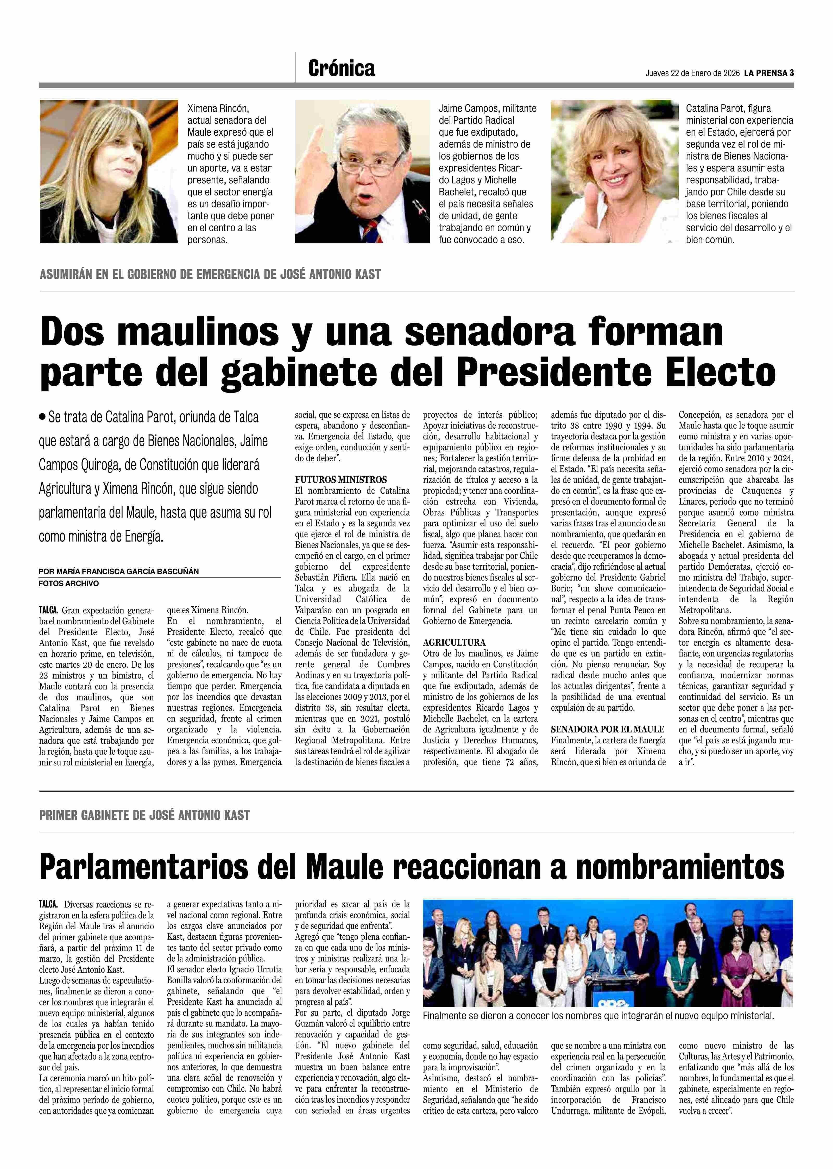 Dos maulinos y una senadora forman parte del gabinete del Presidente Electo 22-01-2026 La Prensa de Curicó |
