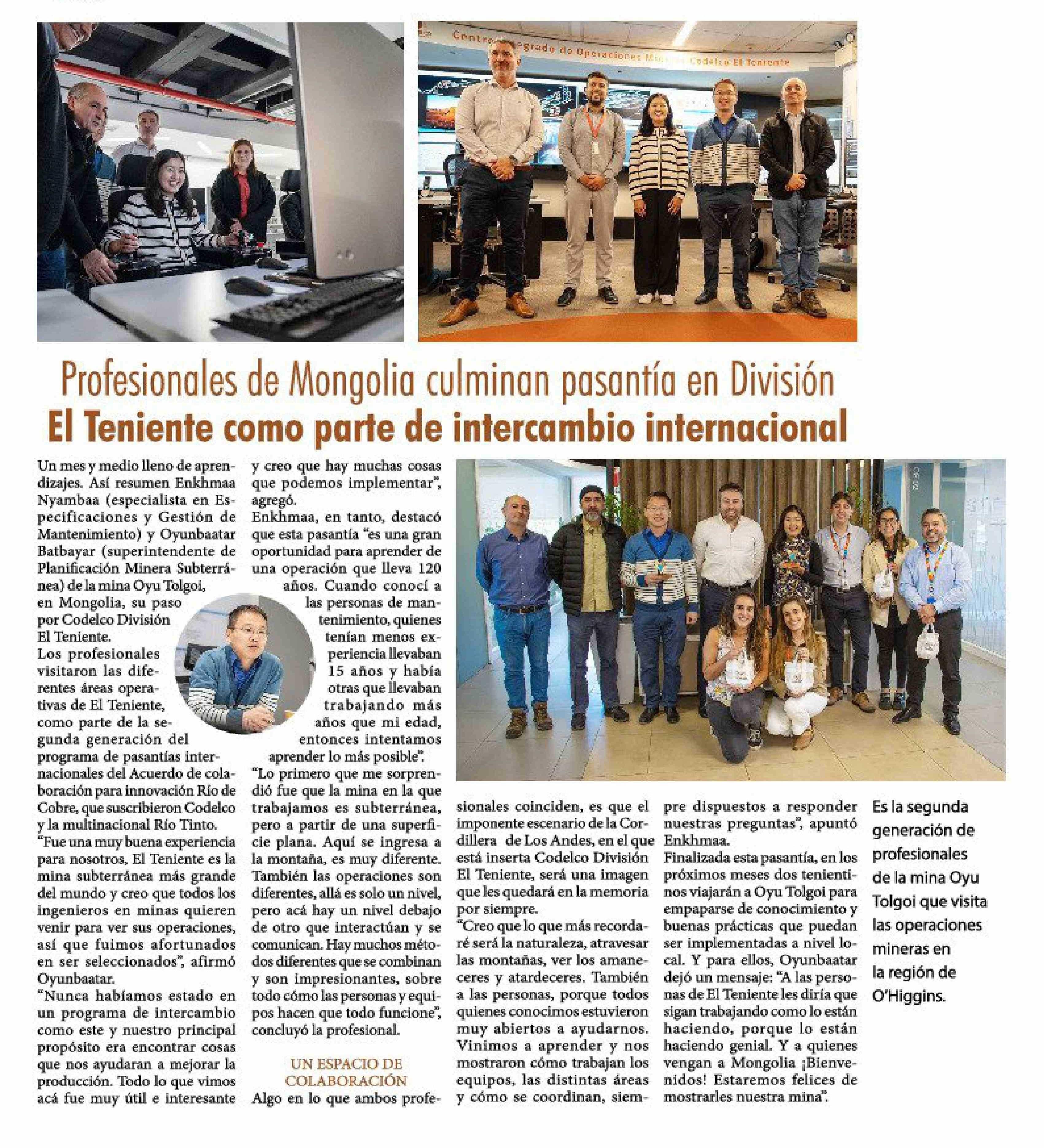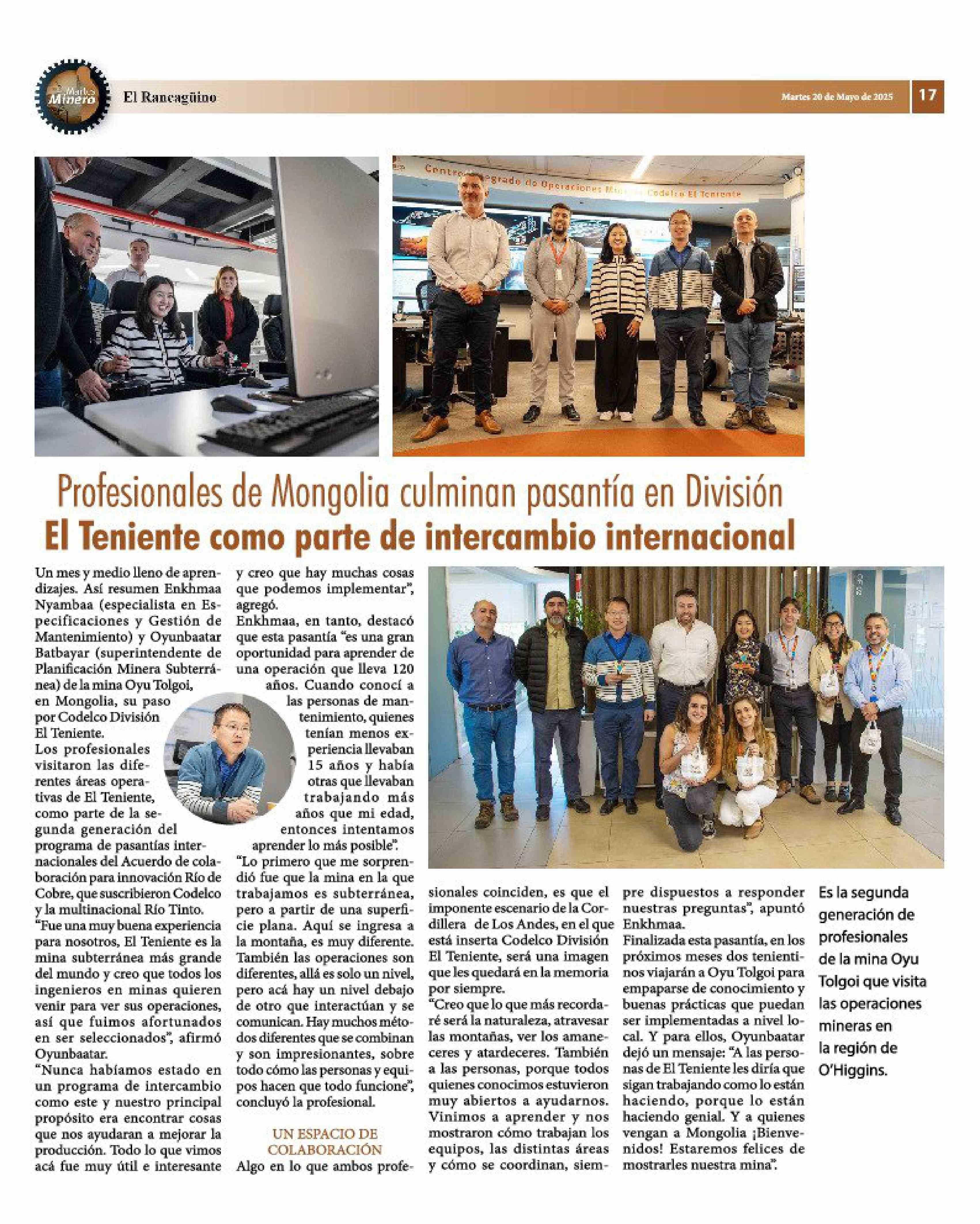 Profesionales de Mongolia culminan pasantía en División El Teniente como parte de intercambio internacional 20-05-2025 El Rancagüino |