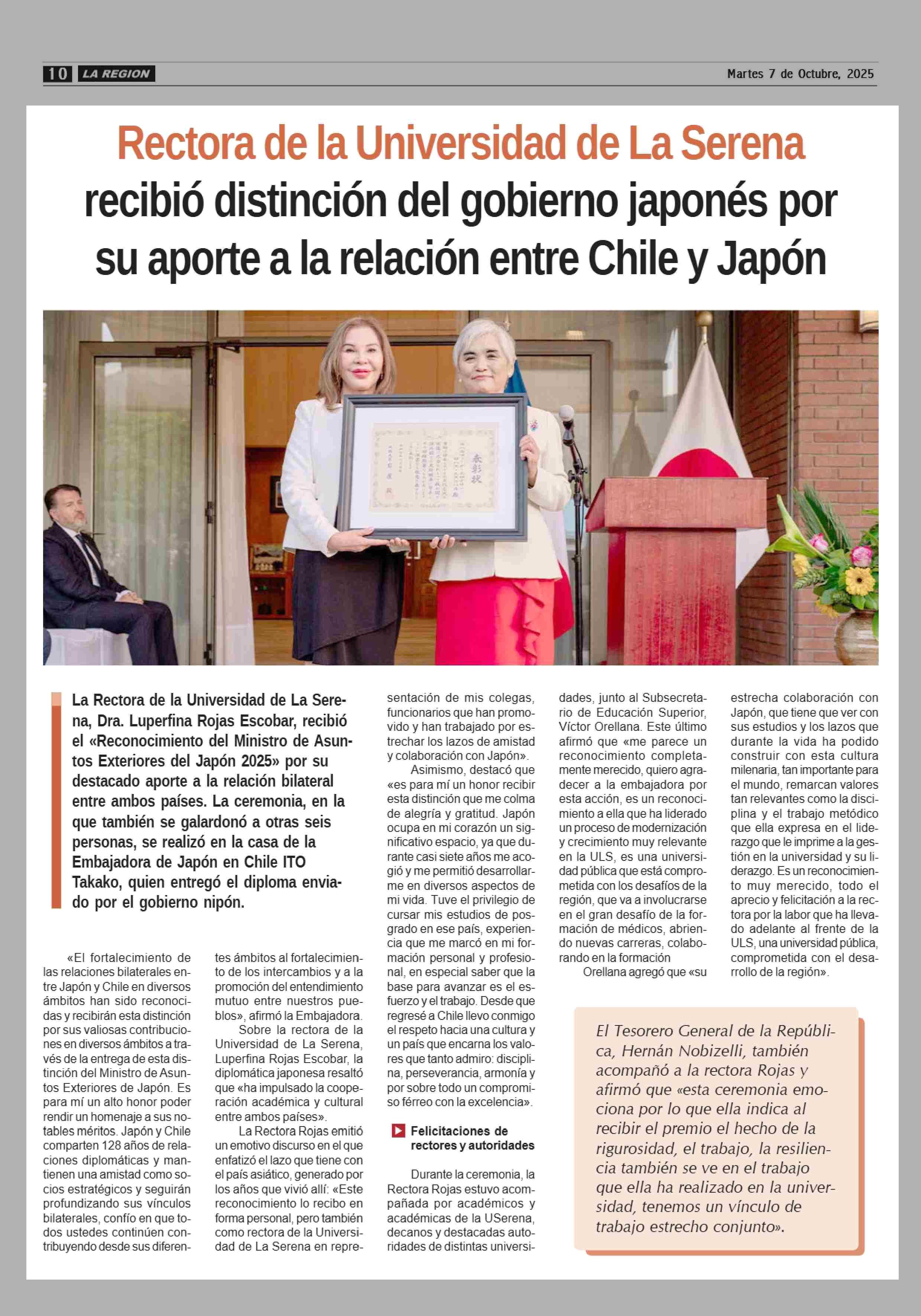 Recibió distinción del gobierno japonés por su aporte a la relación entre Chile y Japón 07-10-2025 Diario la Región |