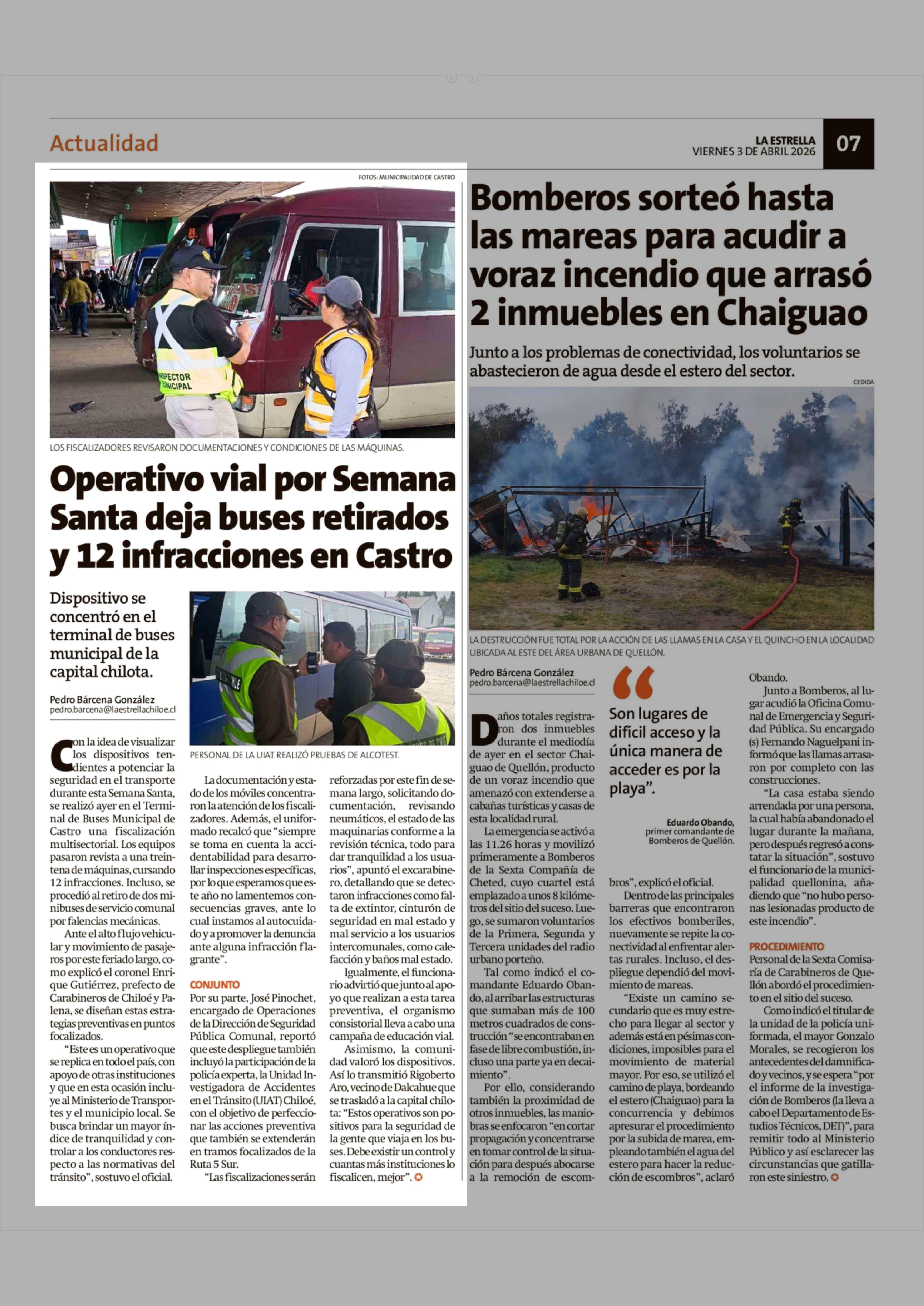 Operativo vial por Semana Santa deja buses retirados y 12 infracciones en Castro 03-04-2026 La Estrella de Chiloé |