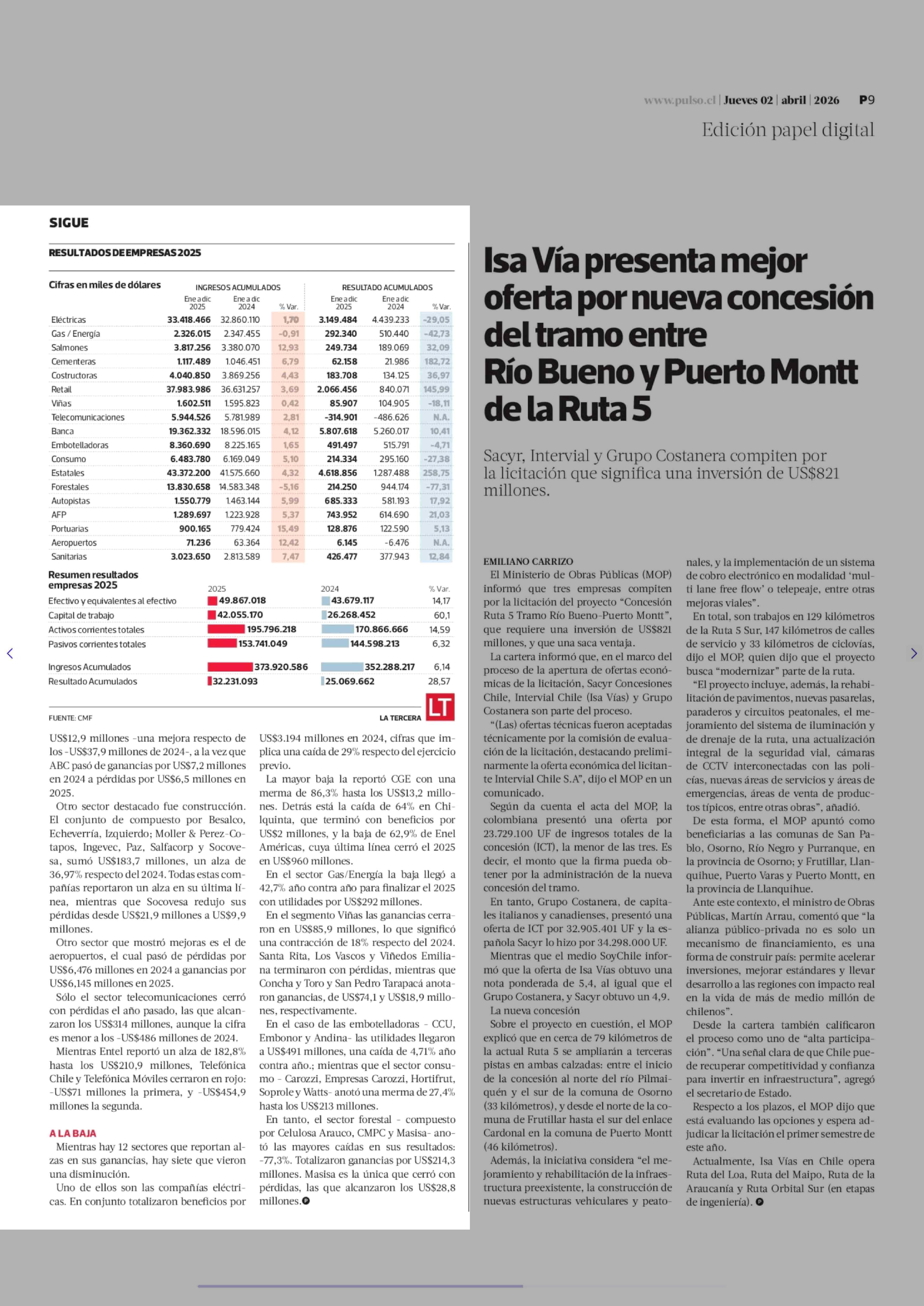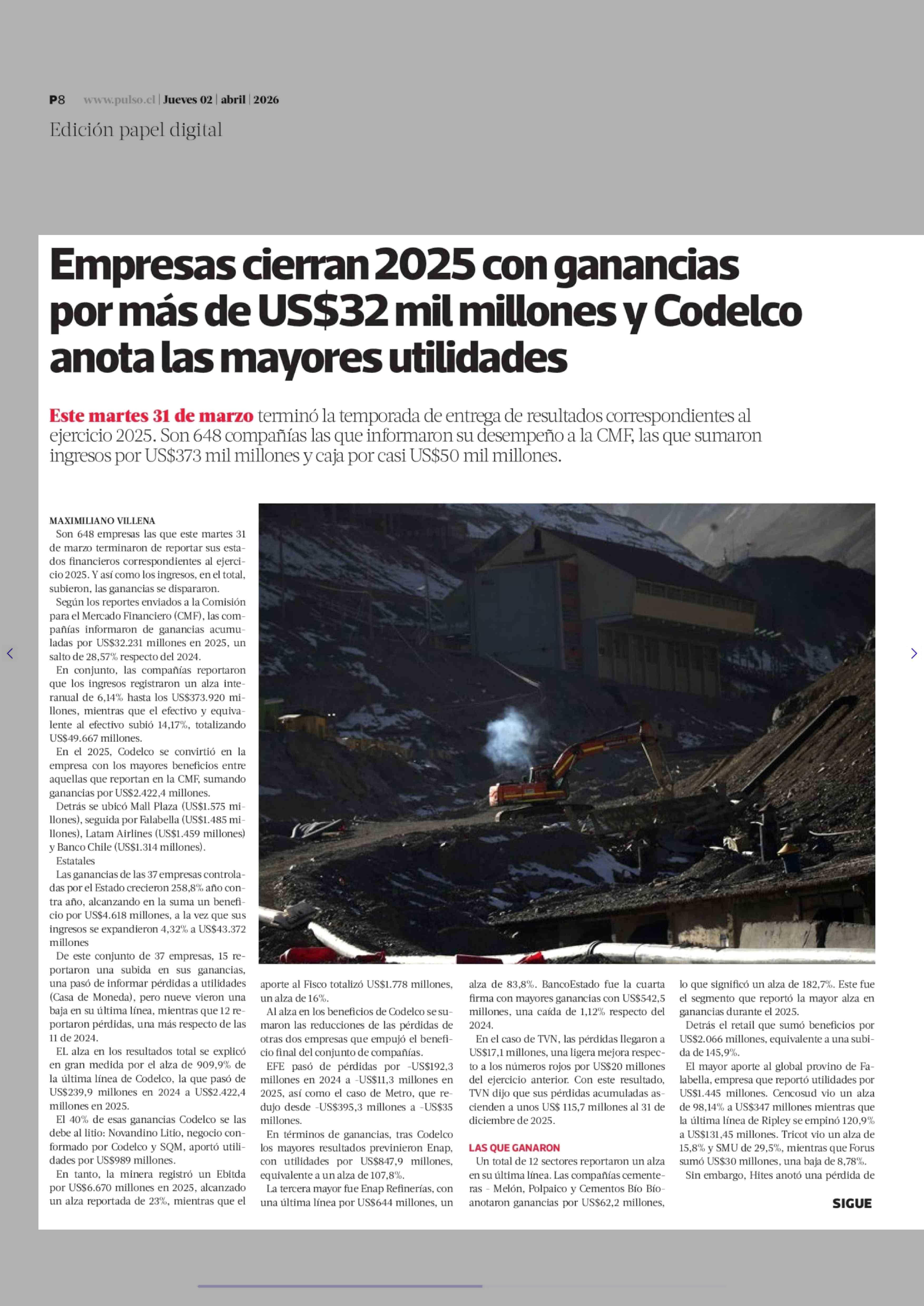 Empresas cierran 2025 con ganancias por más de US$32 mil millones y Codelco anota las mayores utilidades 02-04-2026 La Tercera |