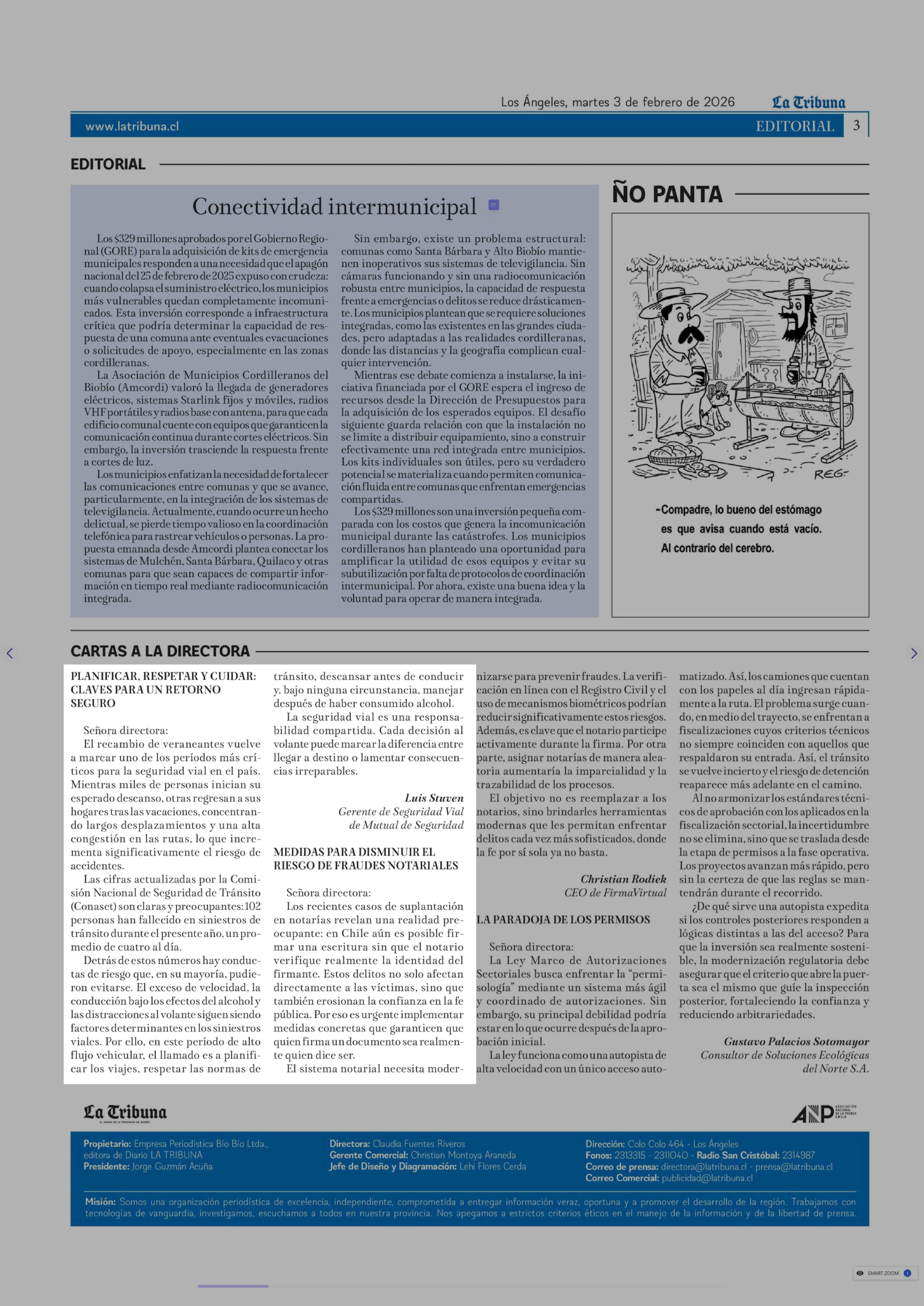 Cartas: PLANIFICAR, RESPETAR Y CUIDAR: CLAVES PARA UN RETORNO SEGURO 03-02-2026 La Tribuna |