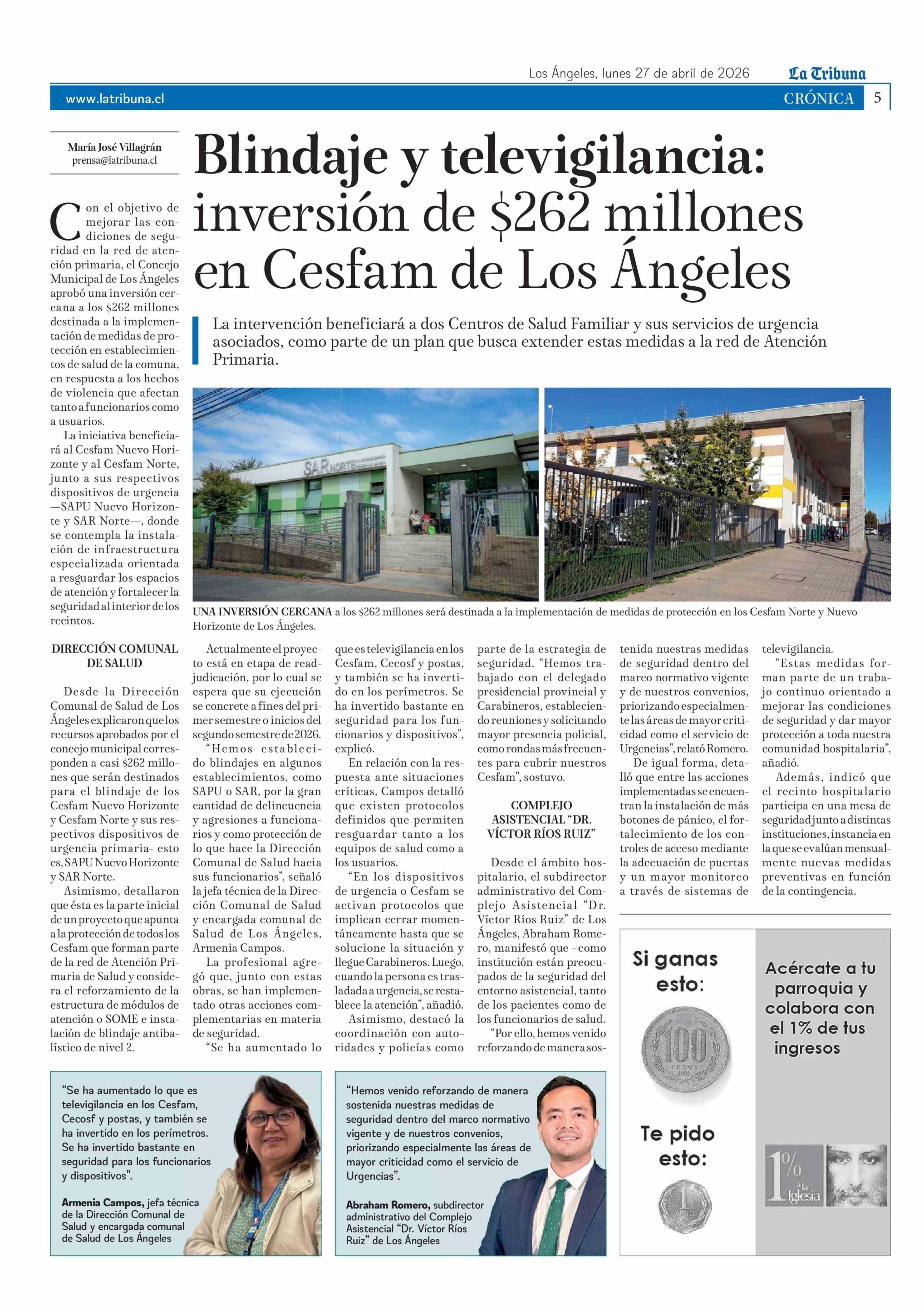 Blindaje y televigilancia: inversión de $262 millones en Cesfam de Los Ángeles 27-04-2026 La Tribuna |