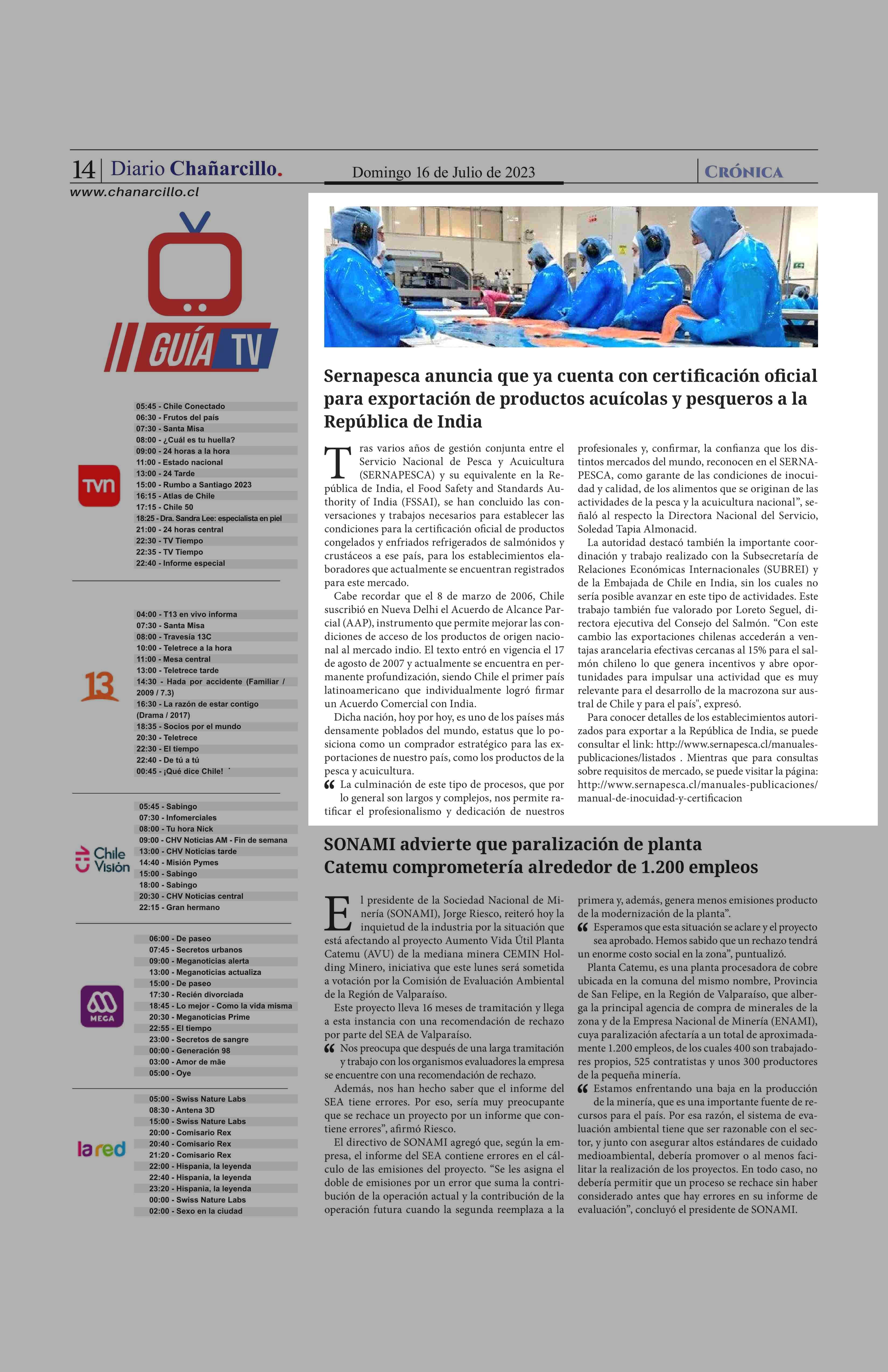 Sernapesca anuncia que ya cuenta con certificación oficial para exportación de productos acuícolas y pesqueros a la República de India 16-07-2023 Diario Chañarcillo |