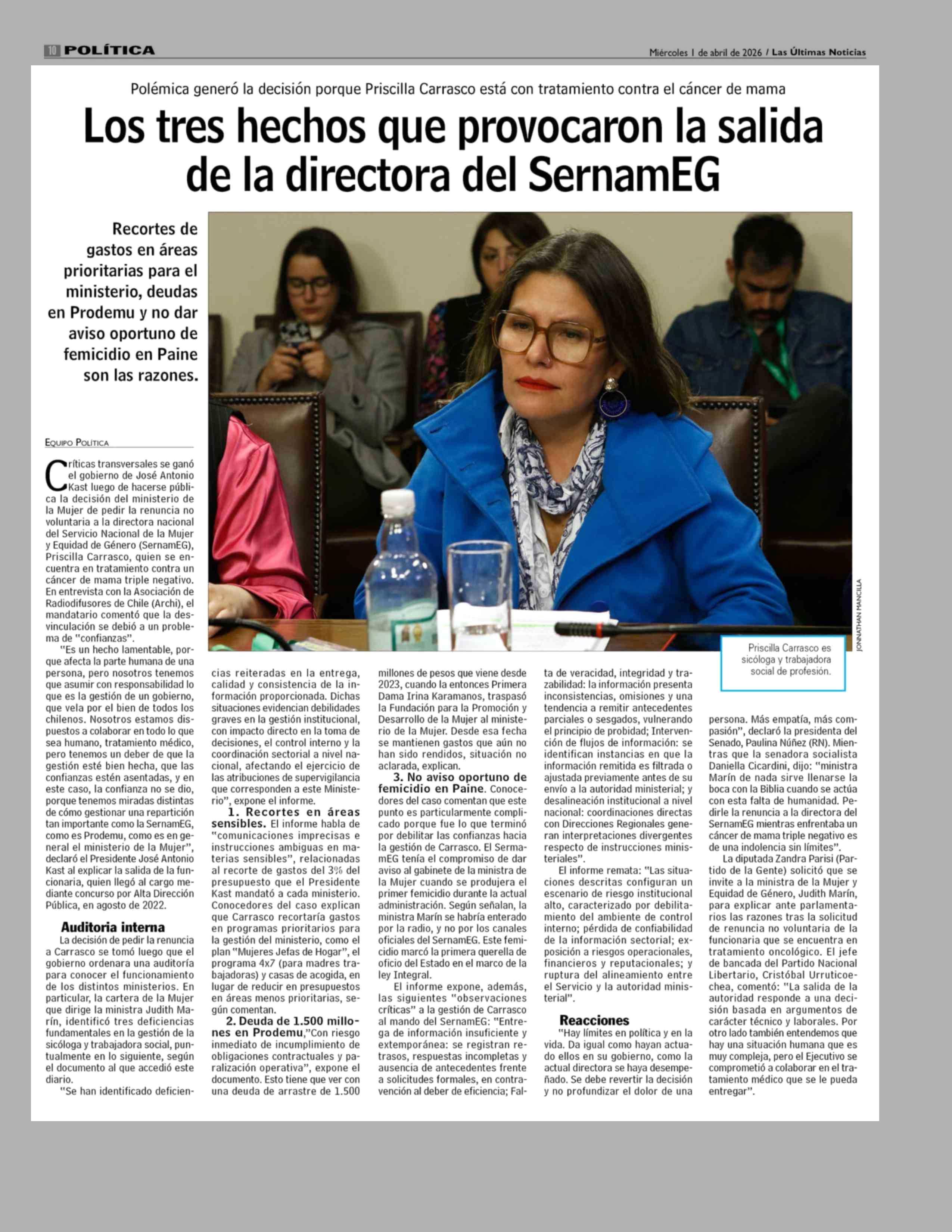 Los tres hechos que provocaron la salida de la directora del SernamEG 01-04-2026 Las Últimas Noticias |