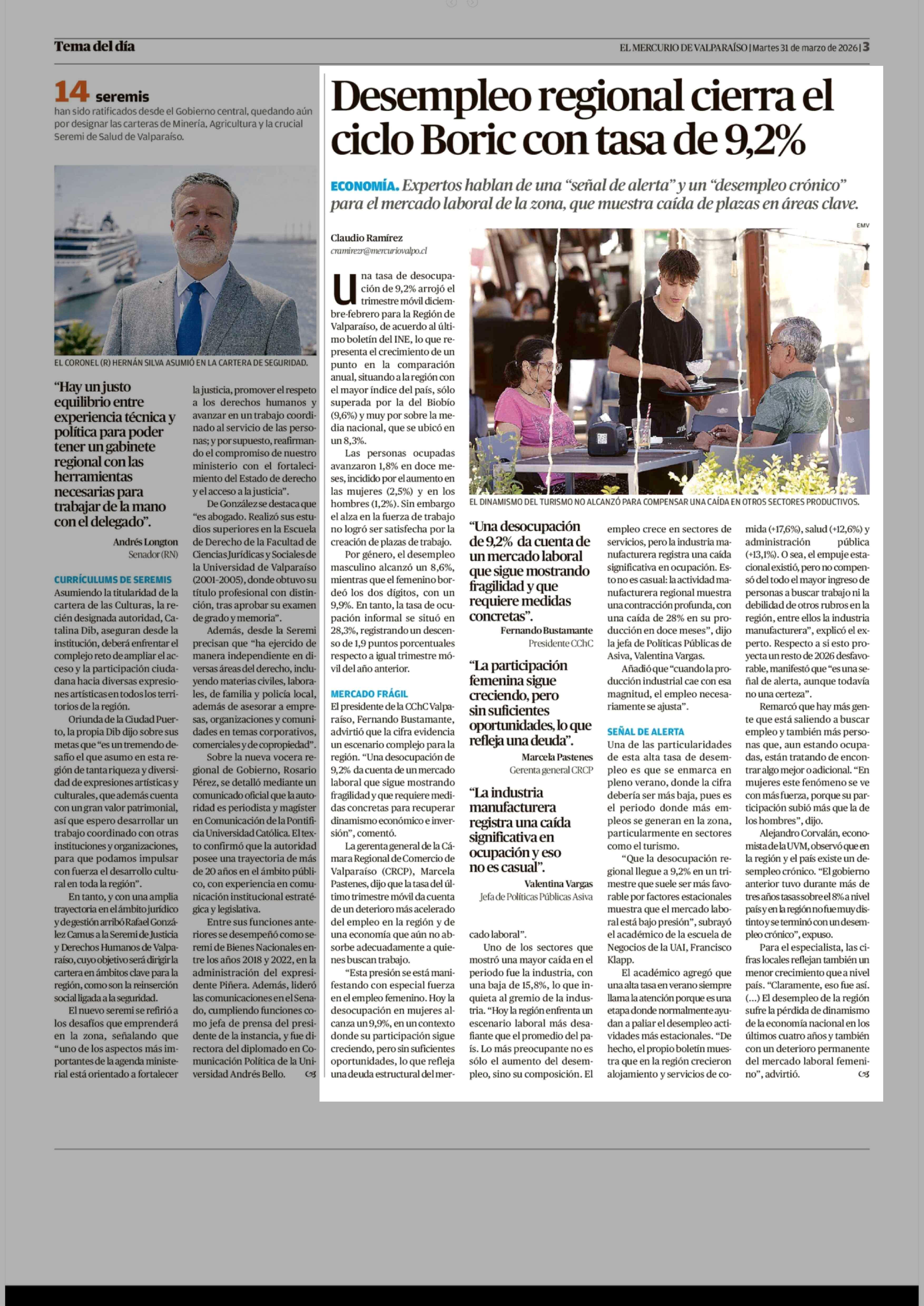 Desempleo regional cierra el ciclo Boric con tasa de 9,2% 31-03-2026 El Mercurio de Valparaíso |