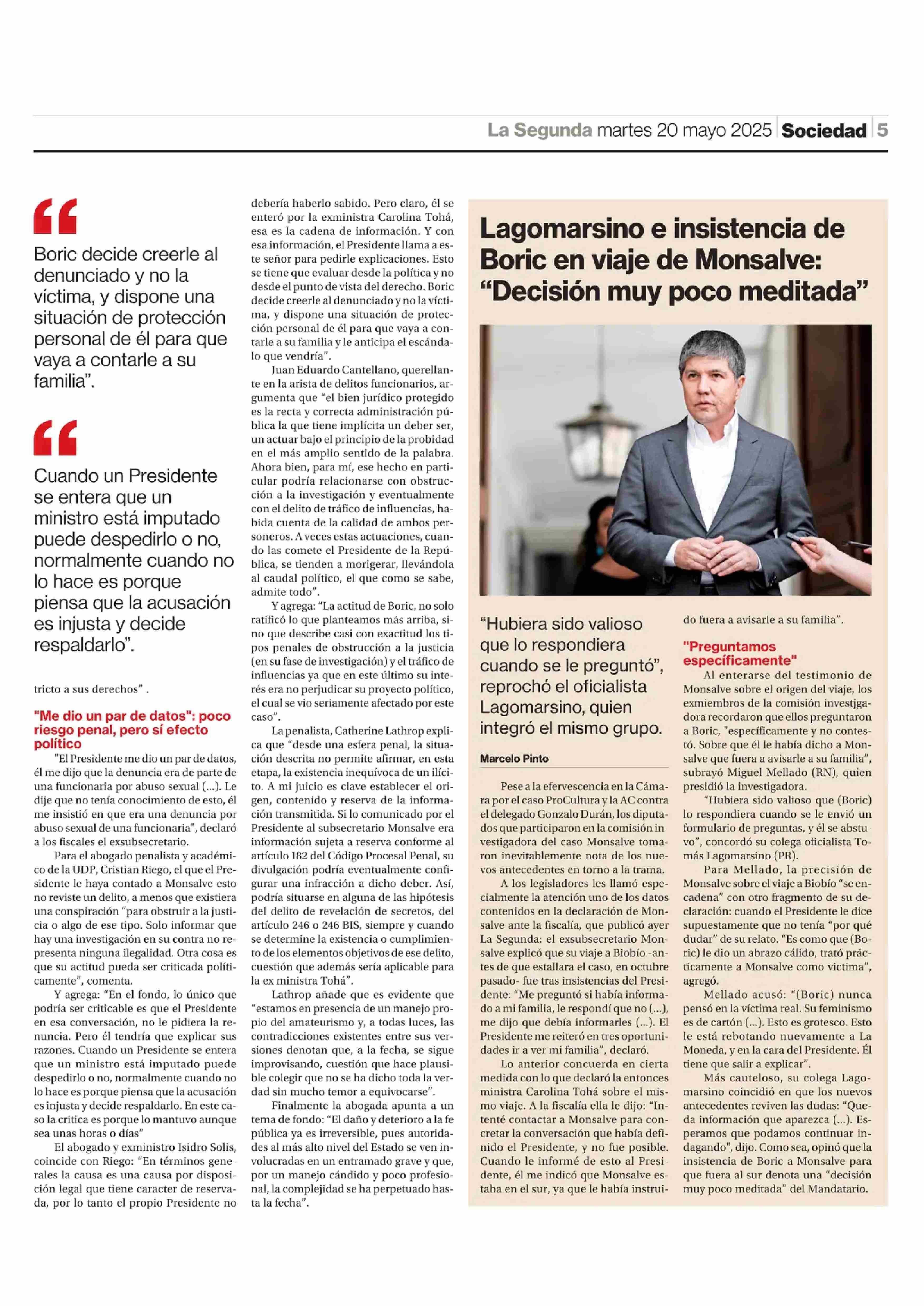 ¿Por qué el Presidente le creyó a Monsalve y no a la denunciante? 20-05-2025 La Segunda |