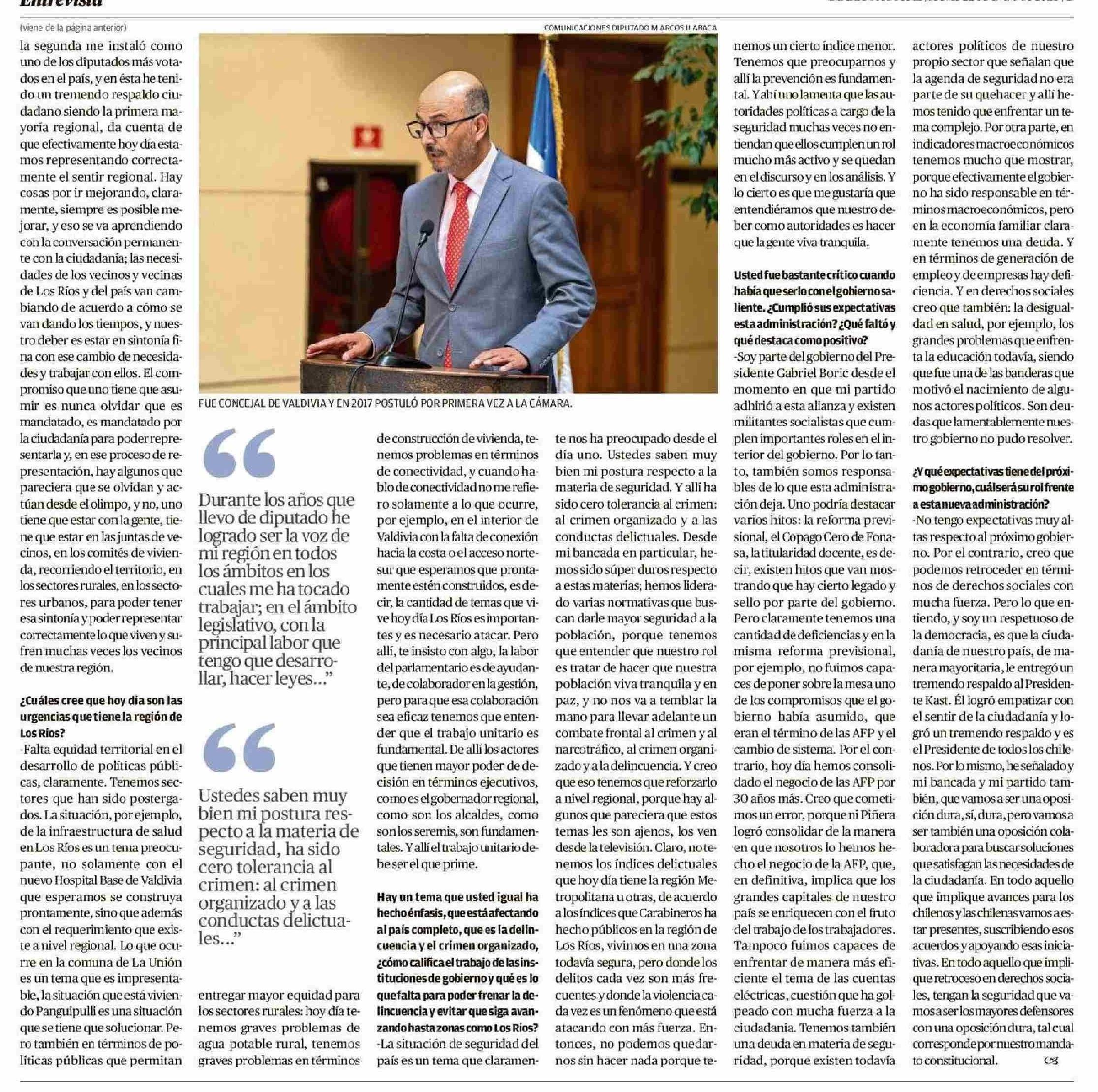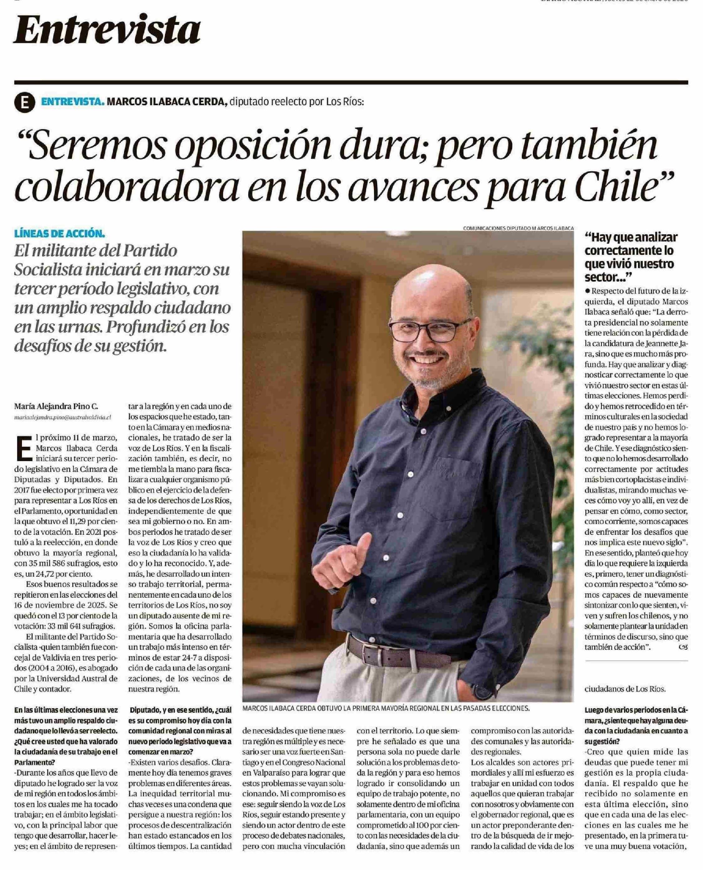"Seremos oposición dura; pero también colaboradora en los avances para Chile" 22-01-2026 Diario Austral Región de Los Ríos |