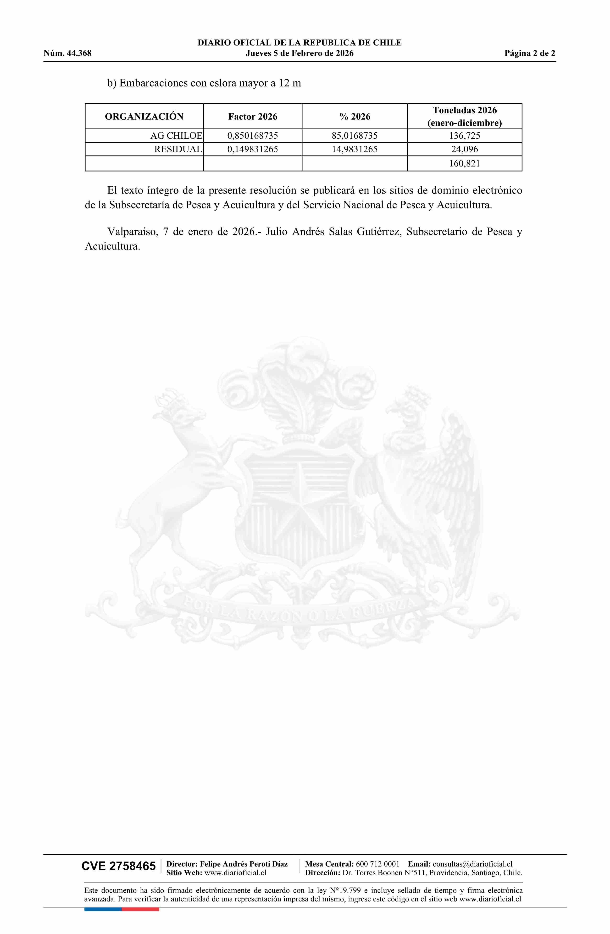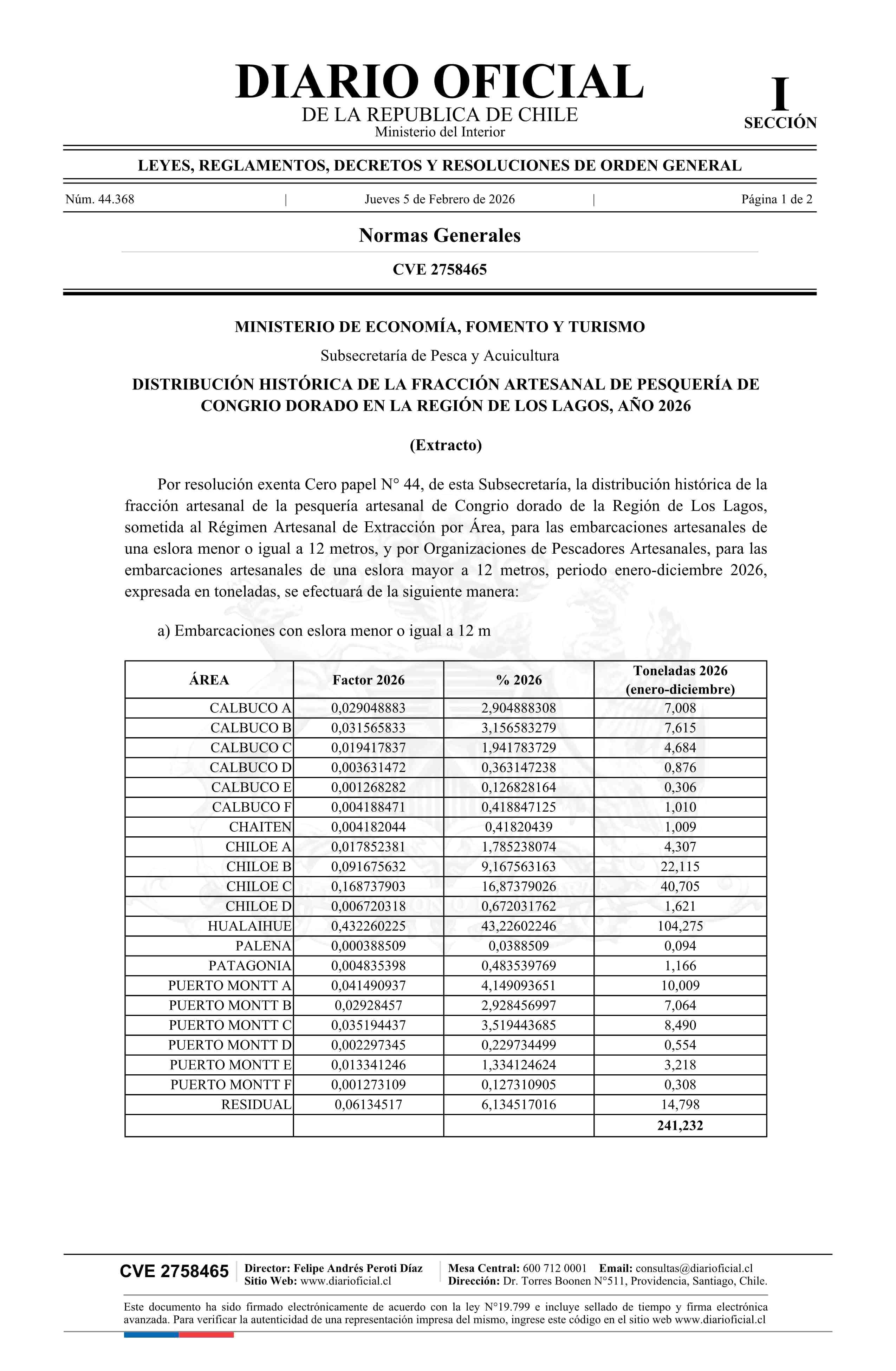 Extracto de resolución exenta número 44, de 2026.- Distribución histórica de la fracción artesanal de pesquería de congrio dorado en la Región de Los Lagos, año 2026 05-02-2026 Diario Oficial Edición Electrónica |