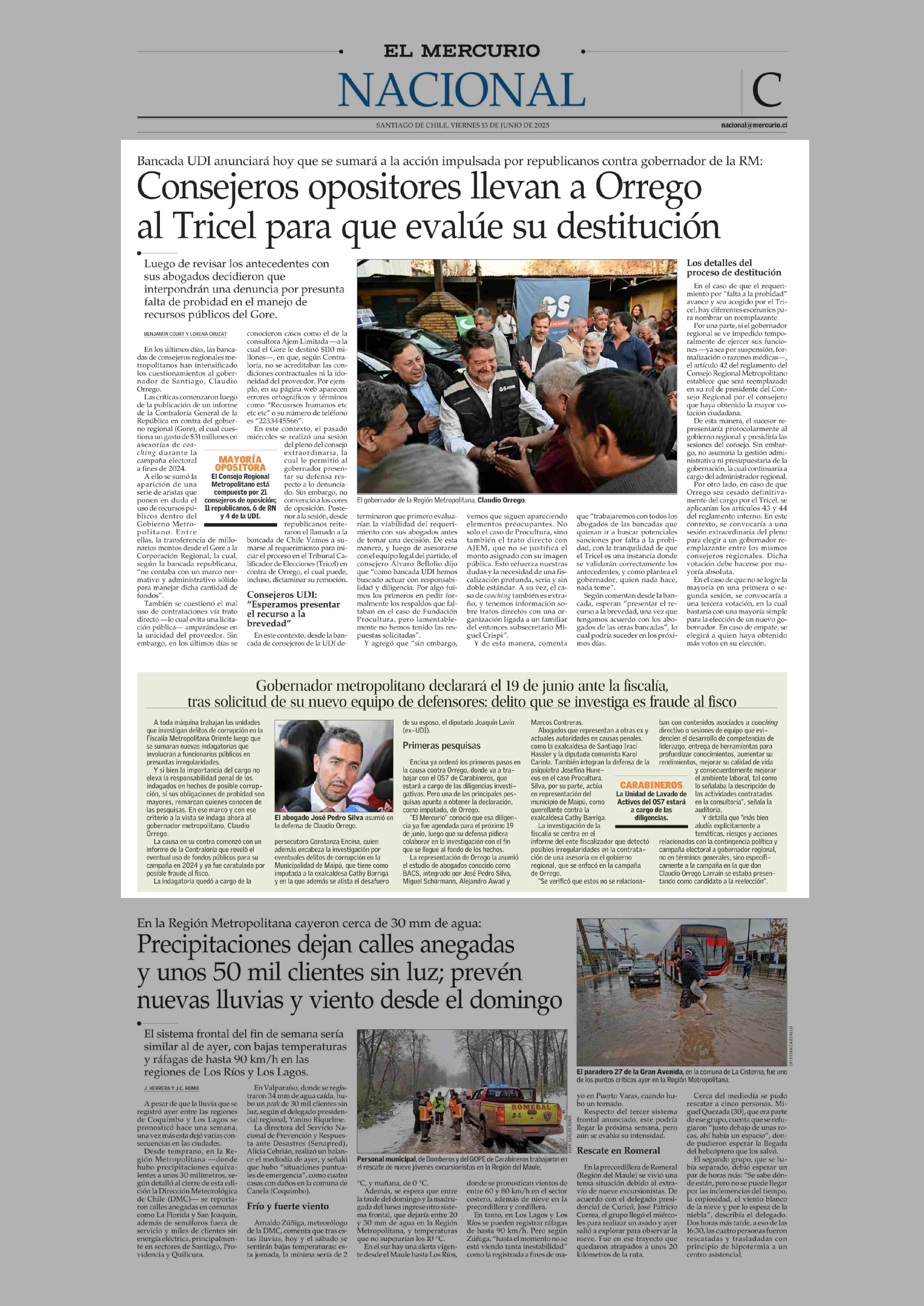 Consejeros opositores llevan a Orrego al Tricel para que evalúe su destitución 13-06-2025 El Mercurio |