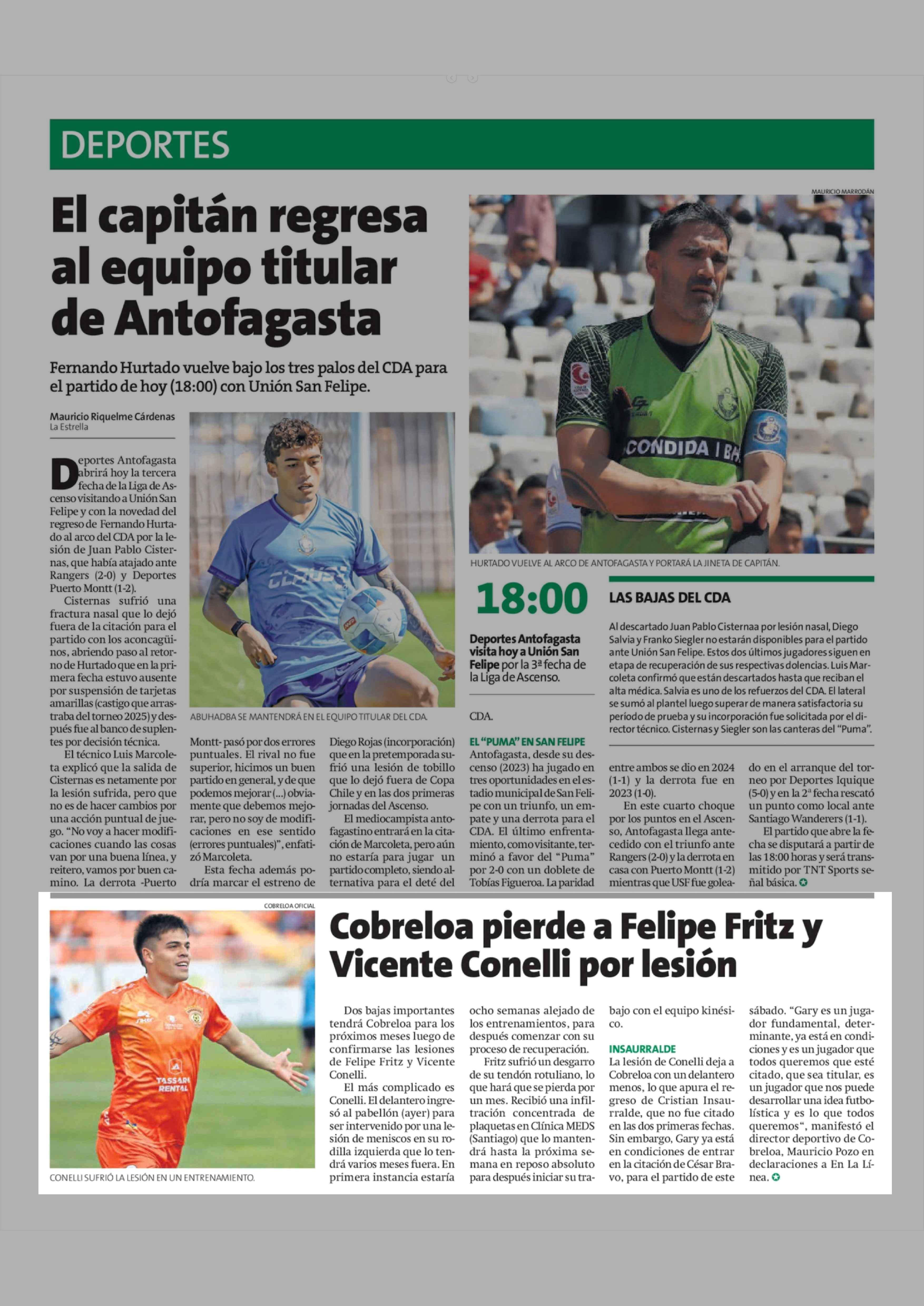 Título: Cobreloa pierde a Felipe Fritz y Vicente Conelli por lesión