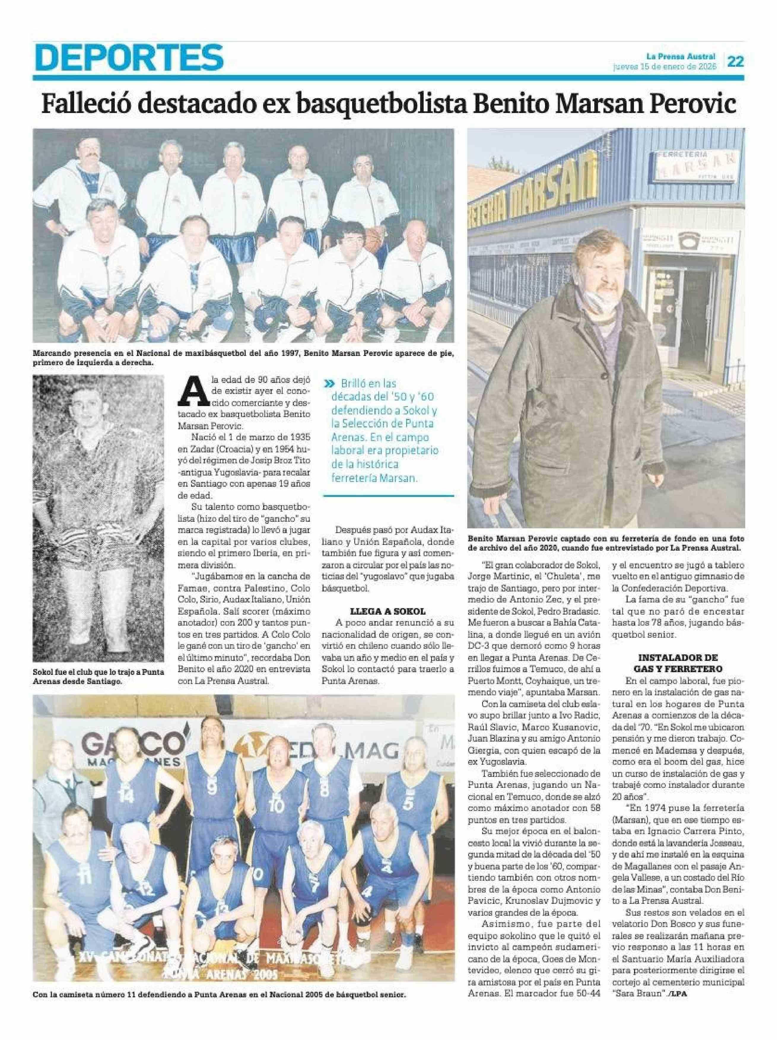 Falleció destacado ex basquetbolista Benito Marsan Perovic 15-01-2026 La Prensa Austral |