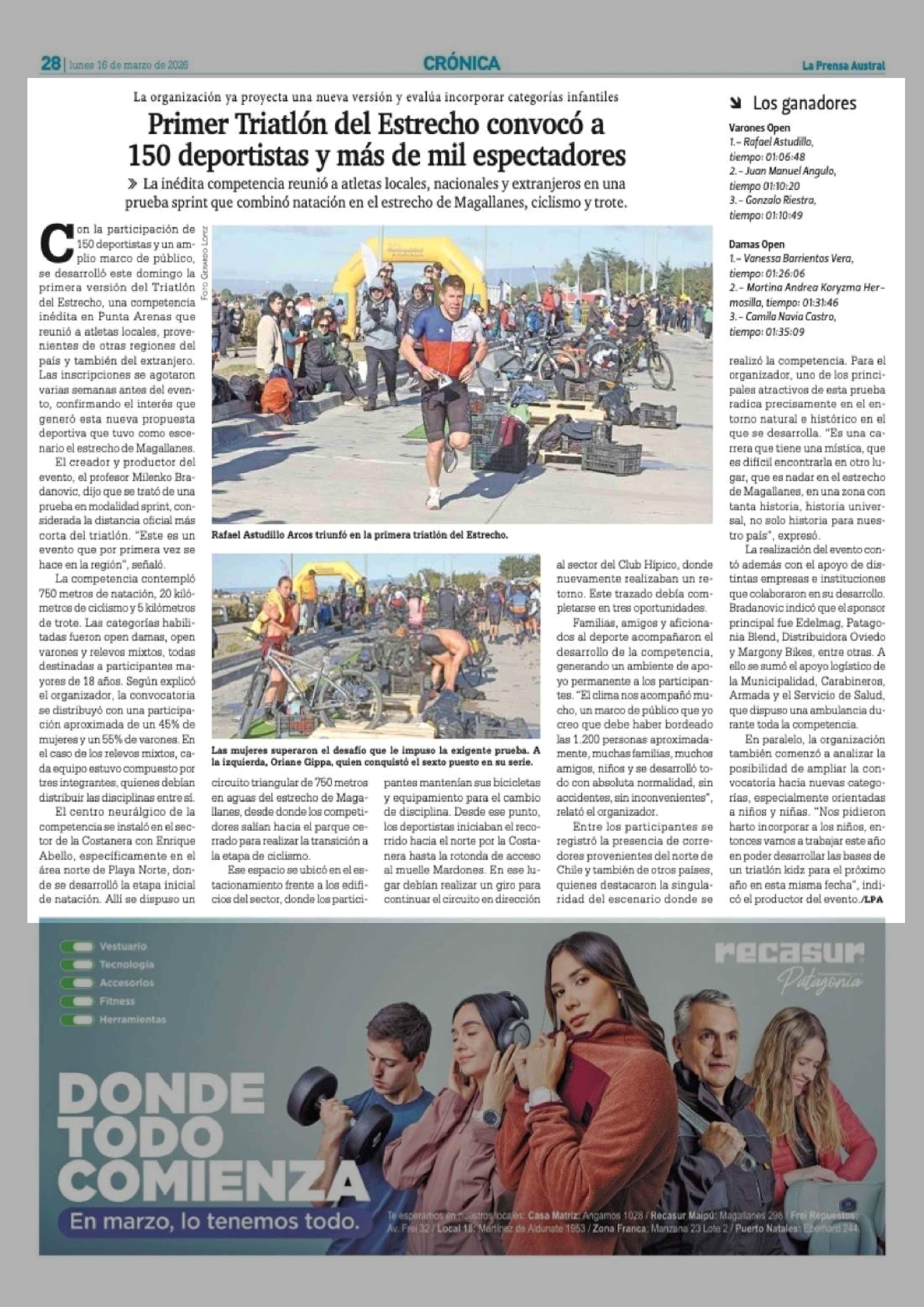Primer Triatlón del Estrecho convocó a 150 deportistas y más de mil espectadores 16-03-2026 La Prensa Austral |