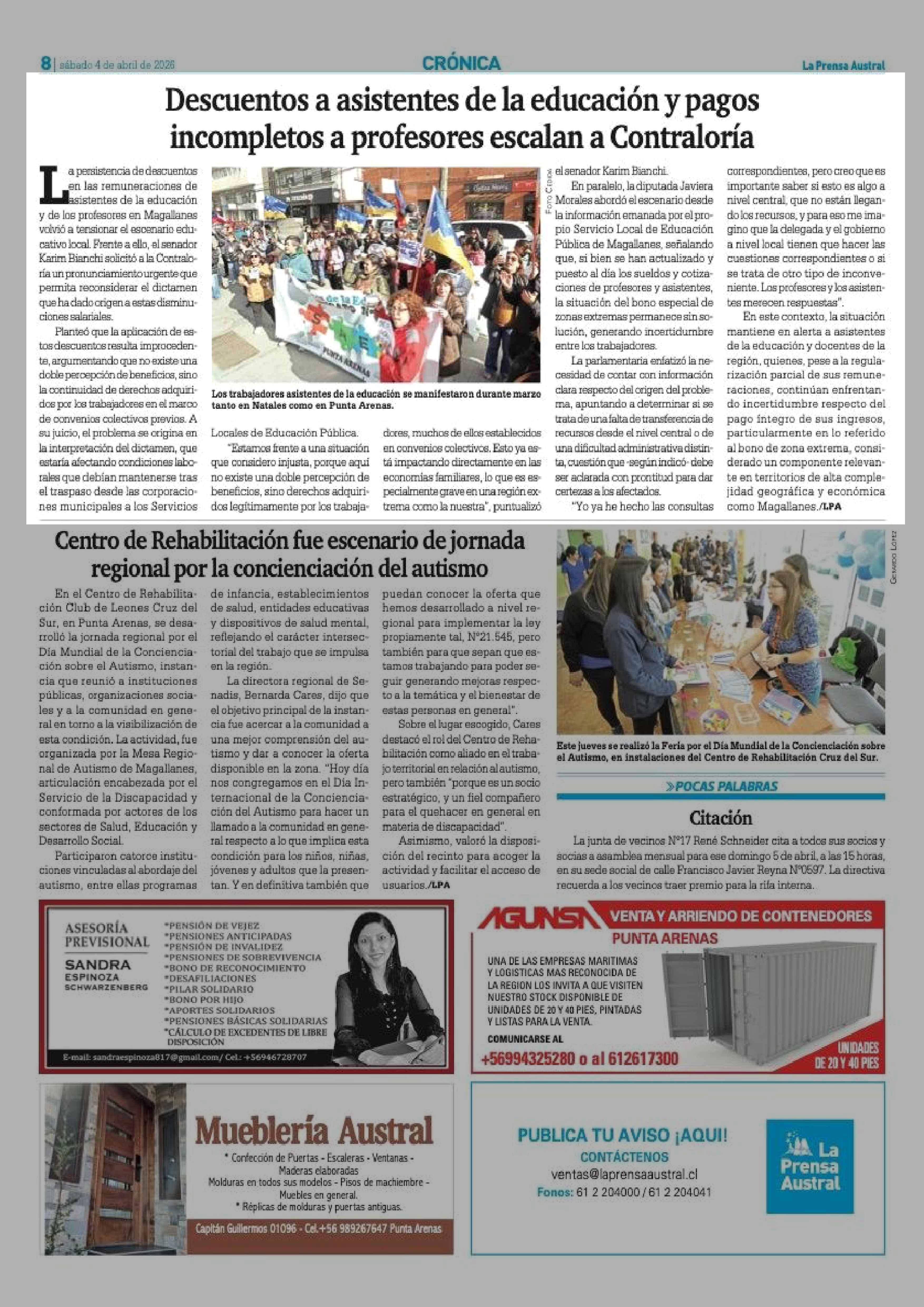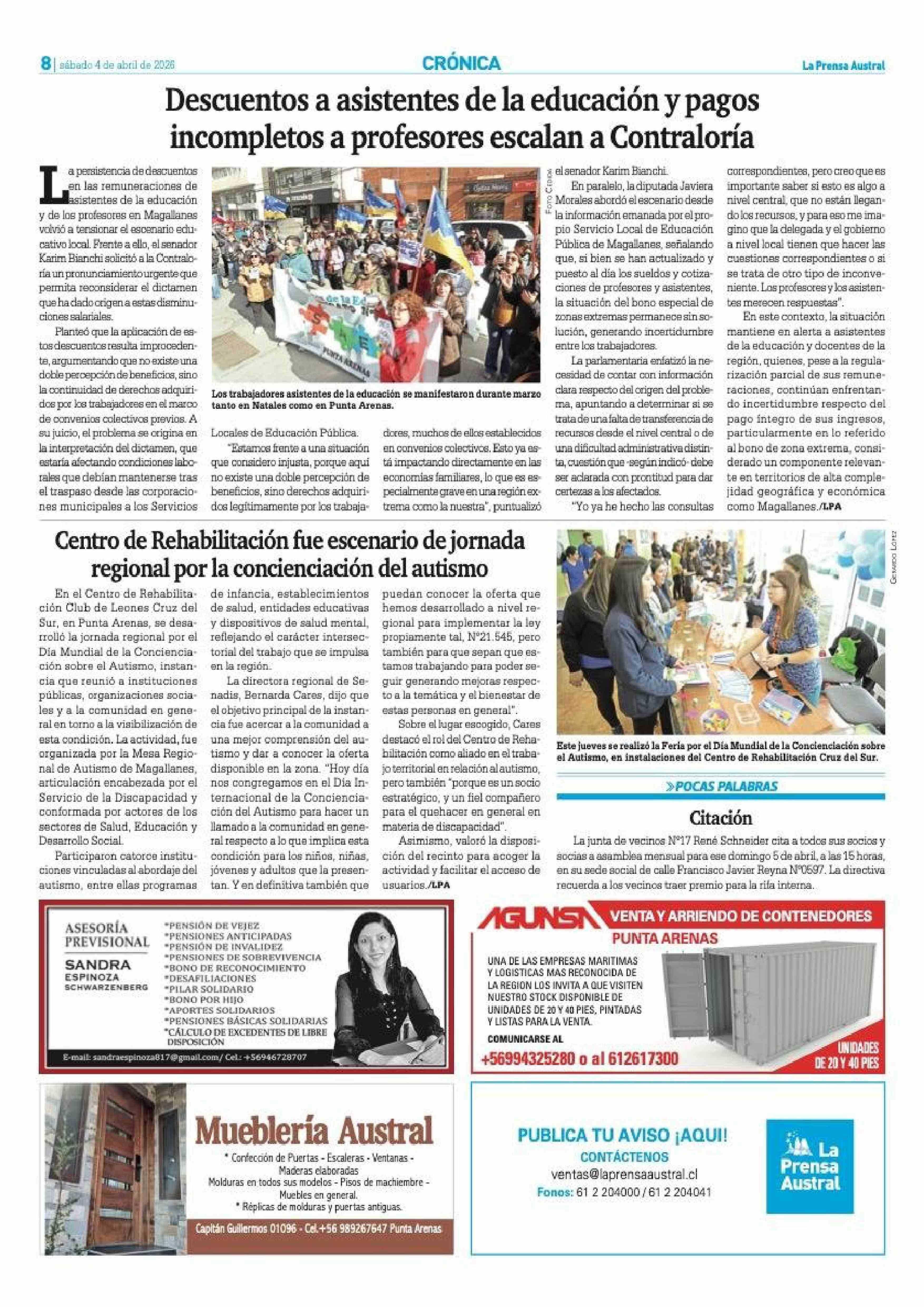 Descuentos a asistentes de la educación y pagos incompletos a profesores escalan a Contraloría 04-04-2026 La Prensa Austral |