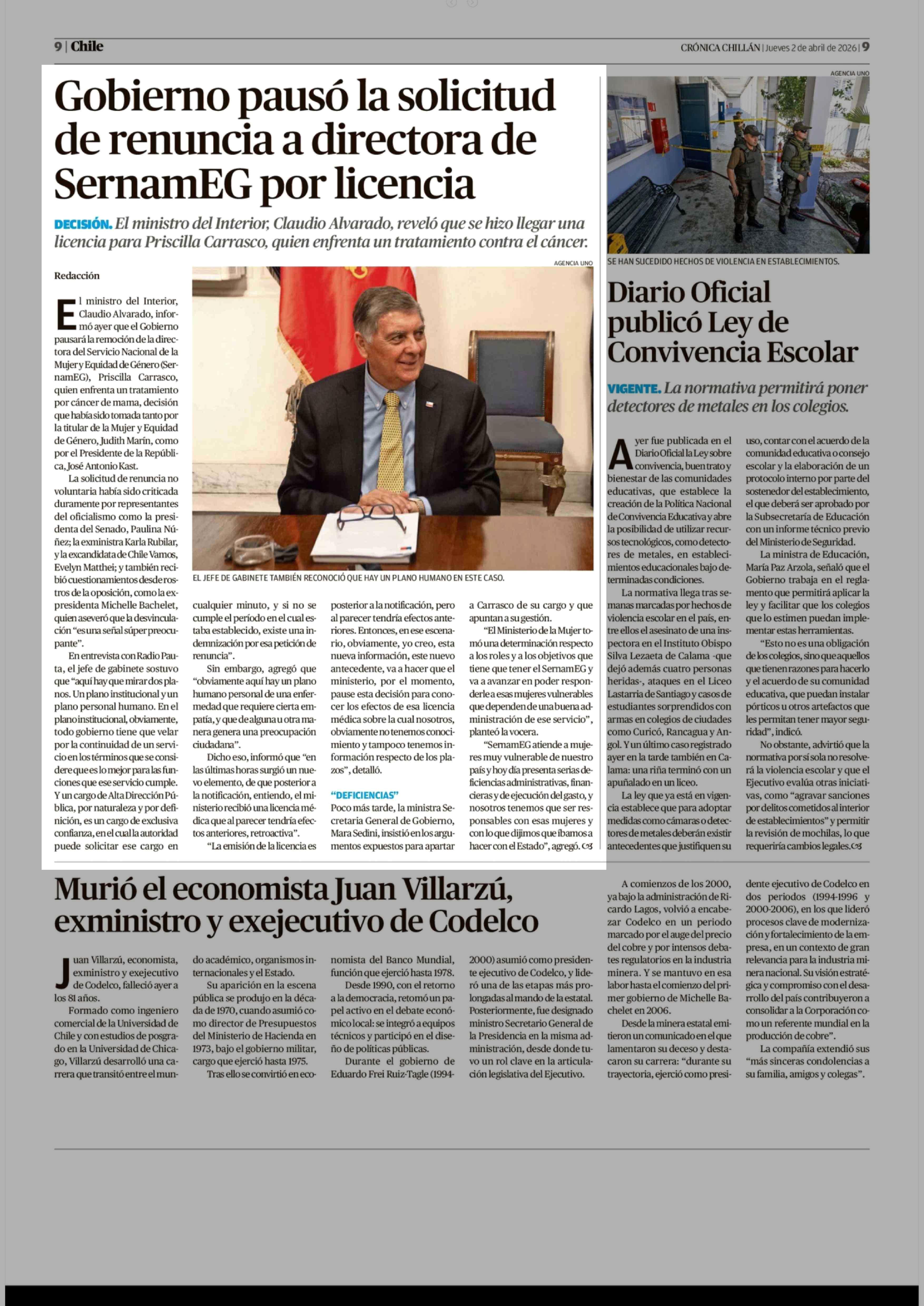 Gobierno pausó la solicitud de renuncia a directora de SernamEG por licencia 02-04-2026 Crónica de Chillán |