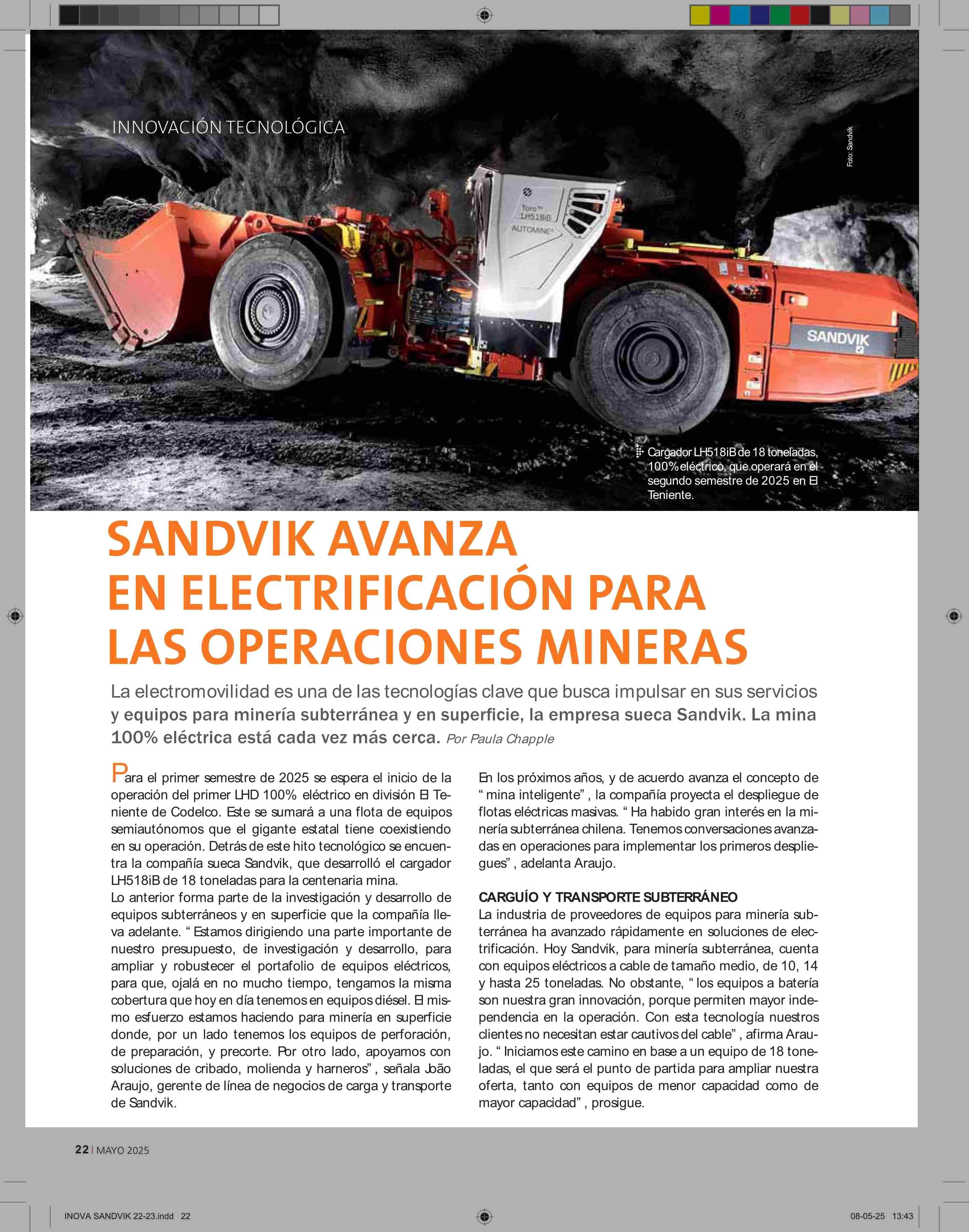 SANDVIK AVANZA EN ELECTRIFICACIÓN PARA LAS OPERACIONES MINERAS 19-05-2025 Revista Nueva Minería & Energía |