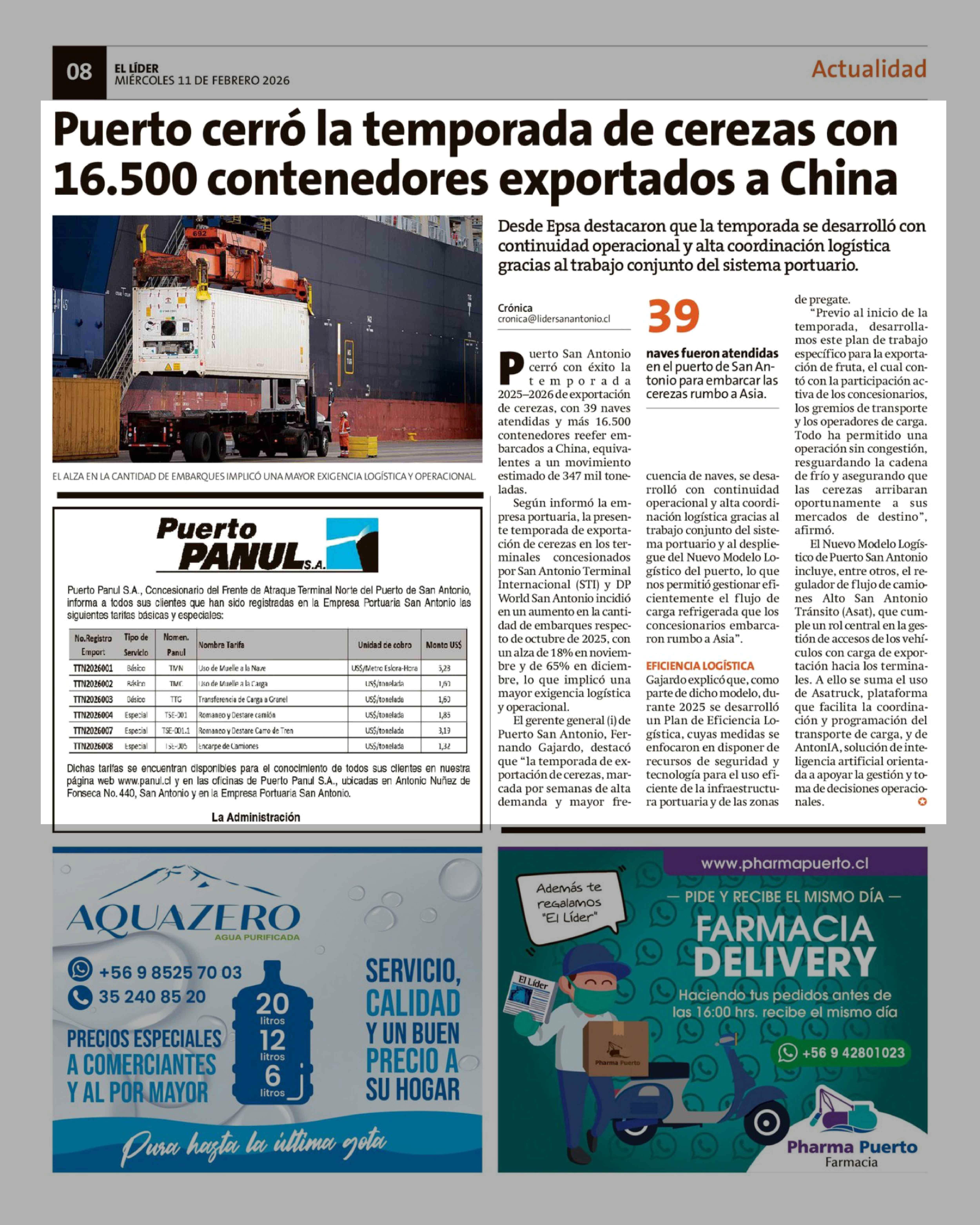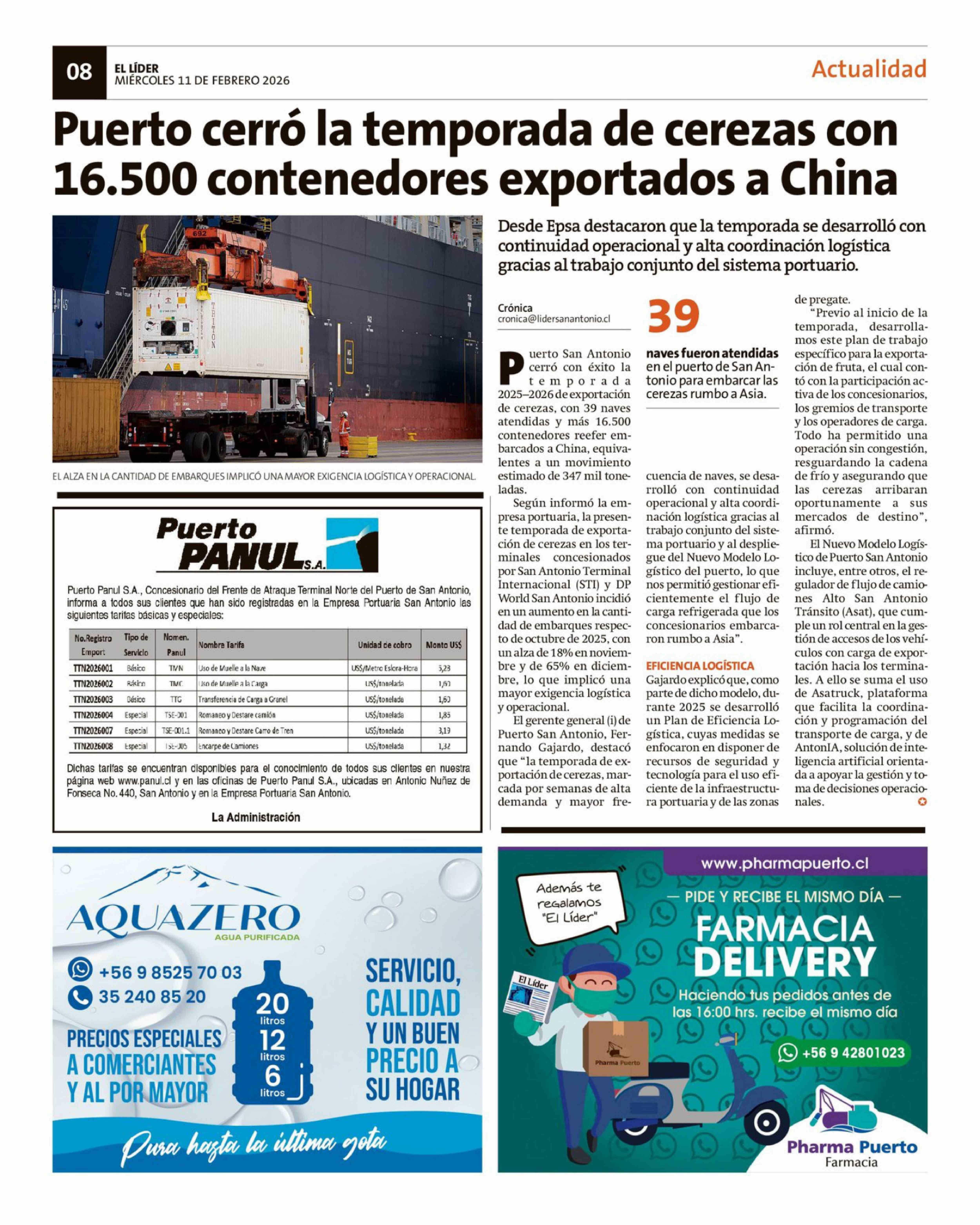 Puerto cerró la temporada de cerezas con 16.500 contenedores exportados a China 11-02-2026 El Líder |