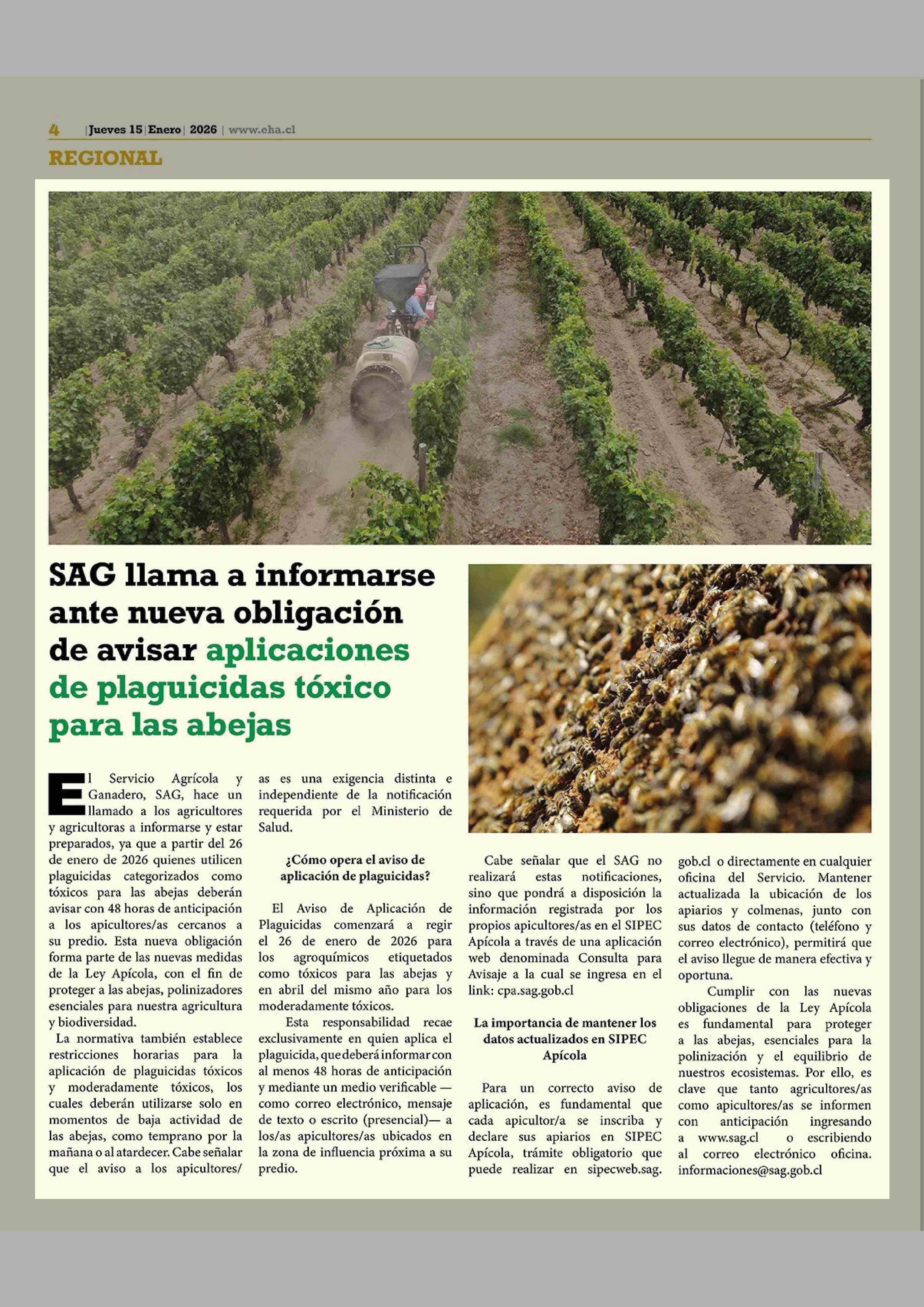 SAG llama a informarse ante nueva obligación de avisar aplicaciones de plaguicidas tóxico para las abejas 15-01-2026 El Heraldo Austral |