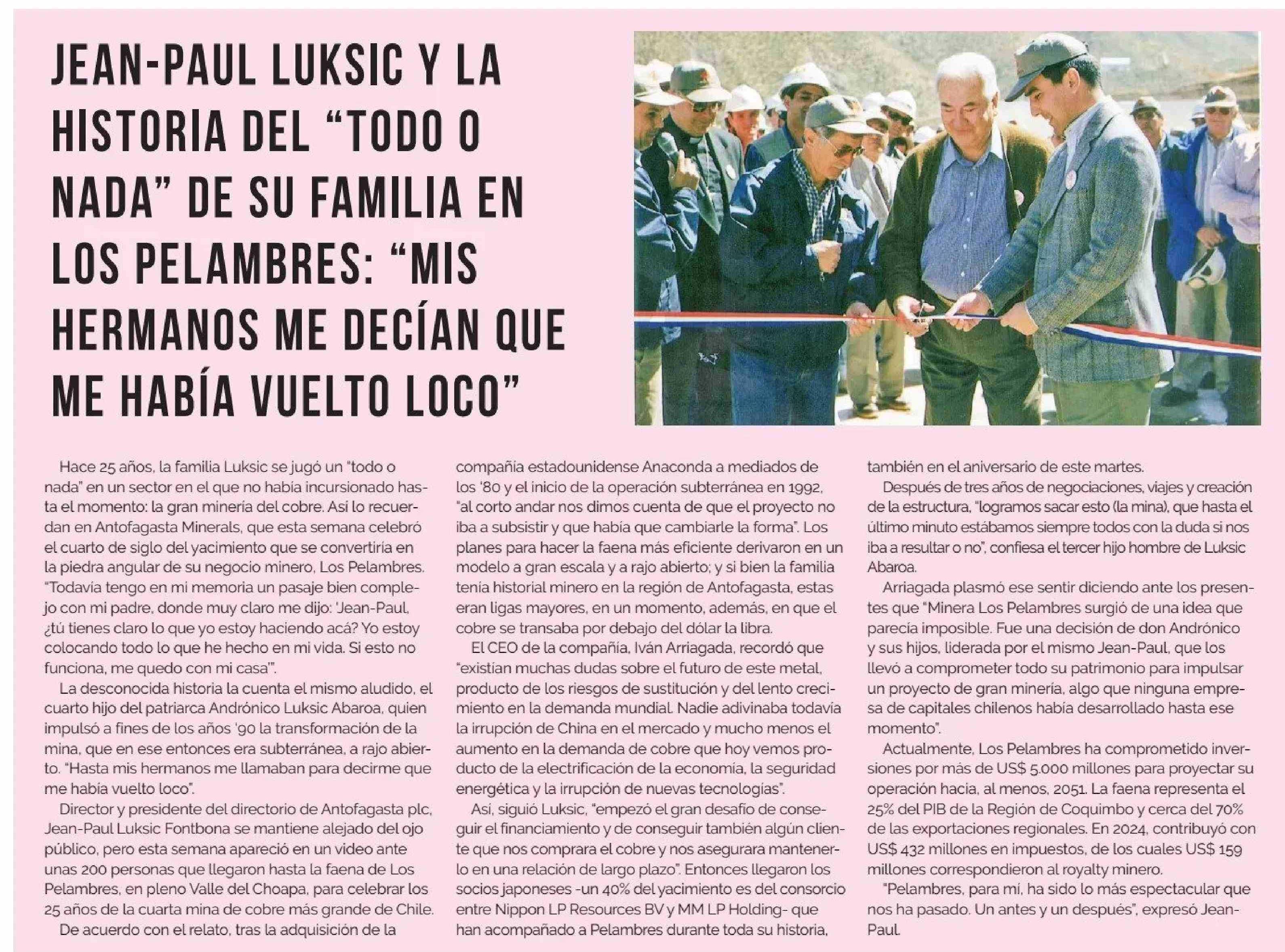 JEAN-PAUL LUKSIC Y LA HISTORIA DEL “TODO O NADA” DE SU FAMILIA EN LOS PELAMBRES: “MIS HERMANOS ME DECÍAN QUE ME HABÍA VUELTO LOCO” 25-05-2025 Diario Financiero |