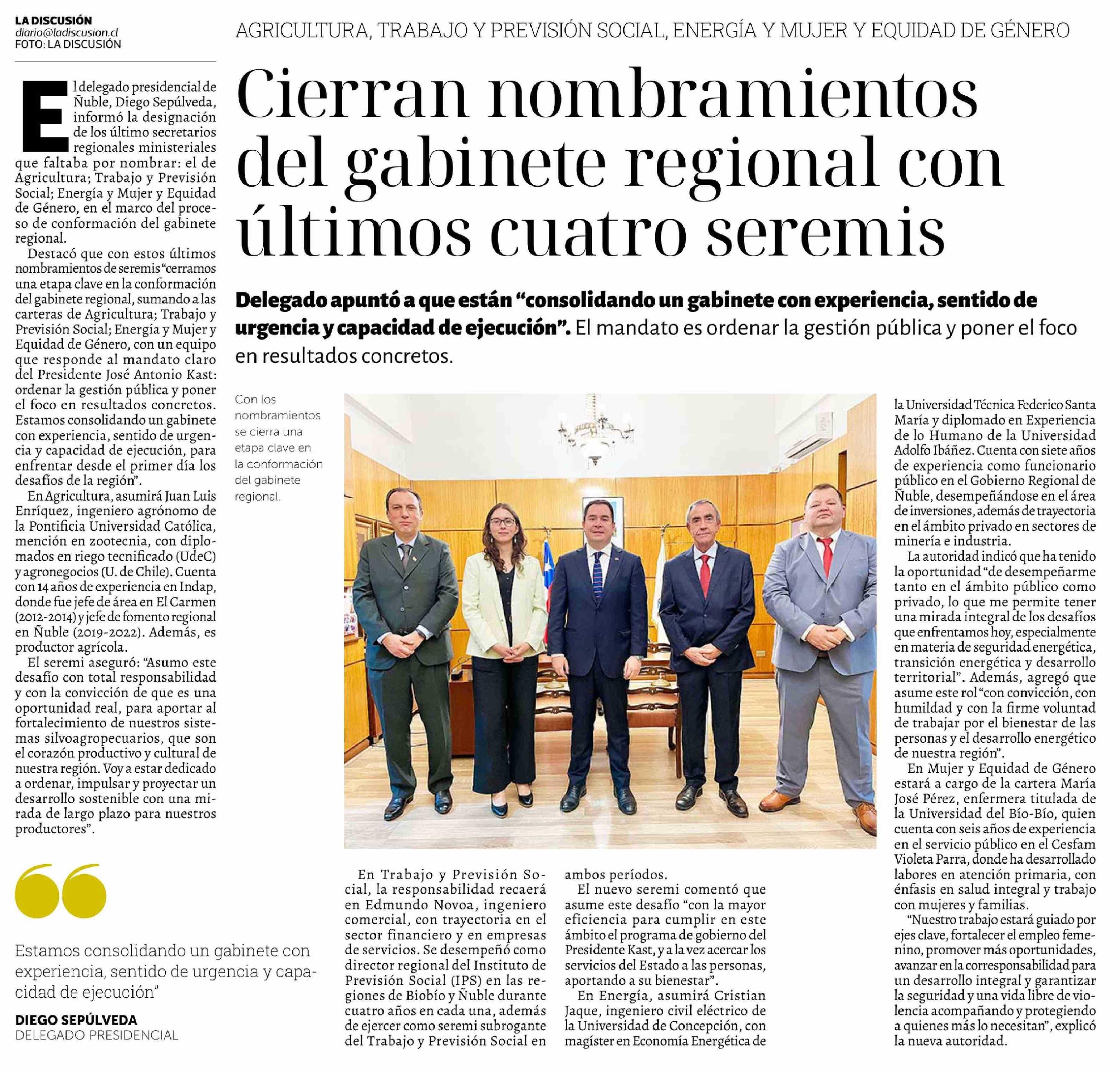 Título: Cierran nombramientos del gabinete regional con últimos cuatro seremis